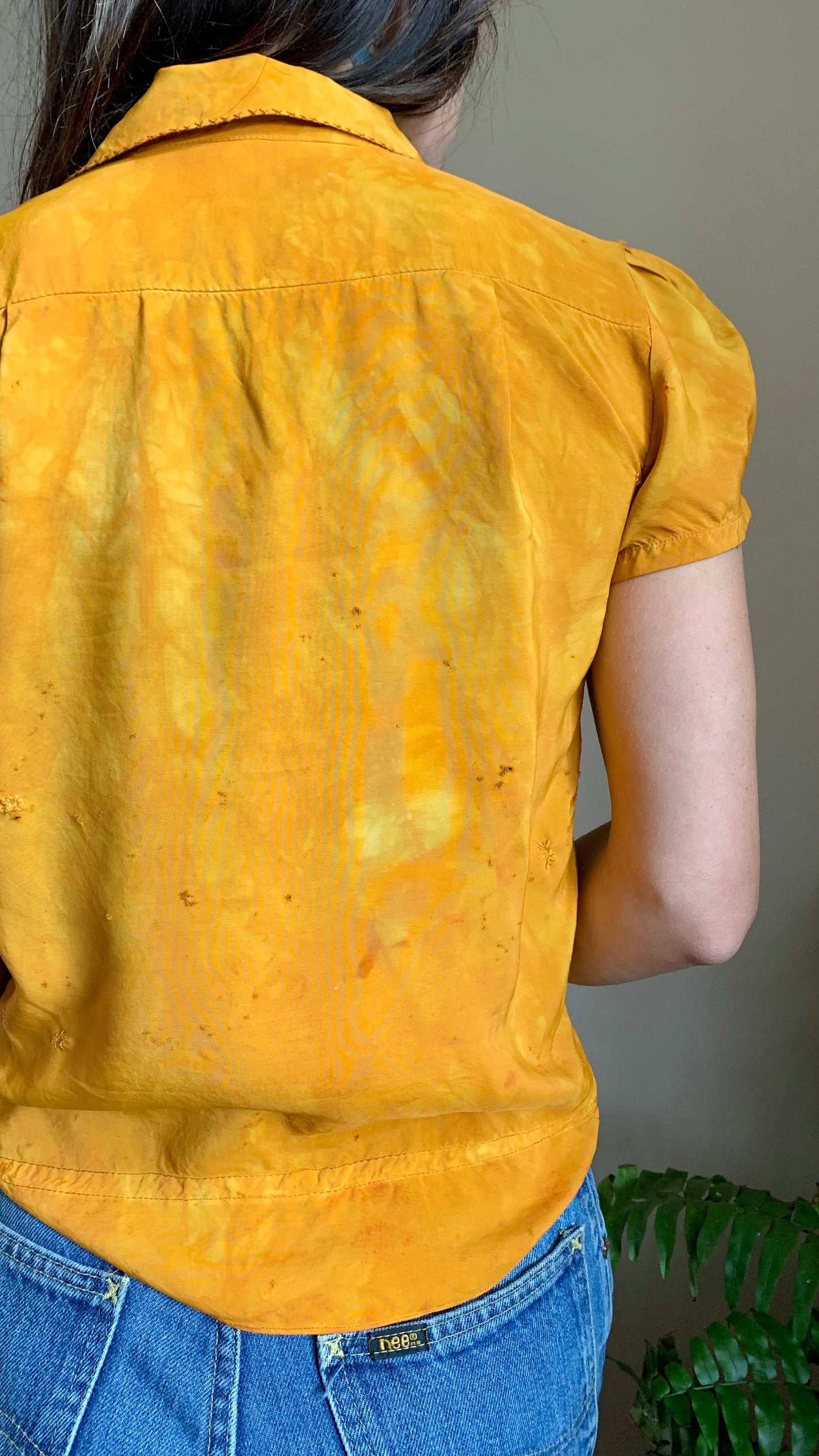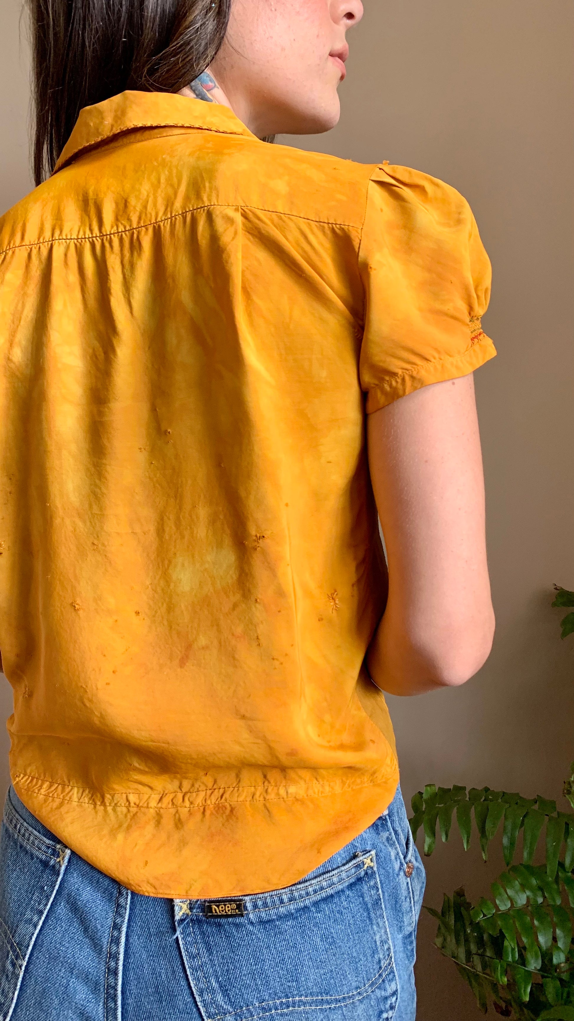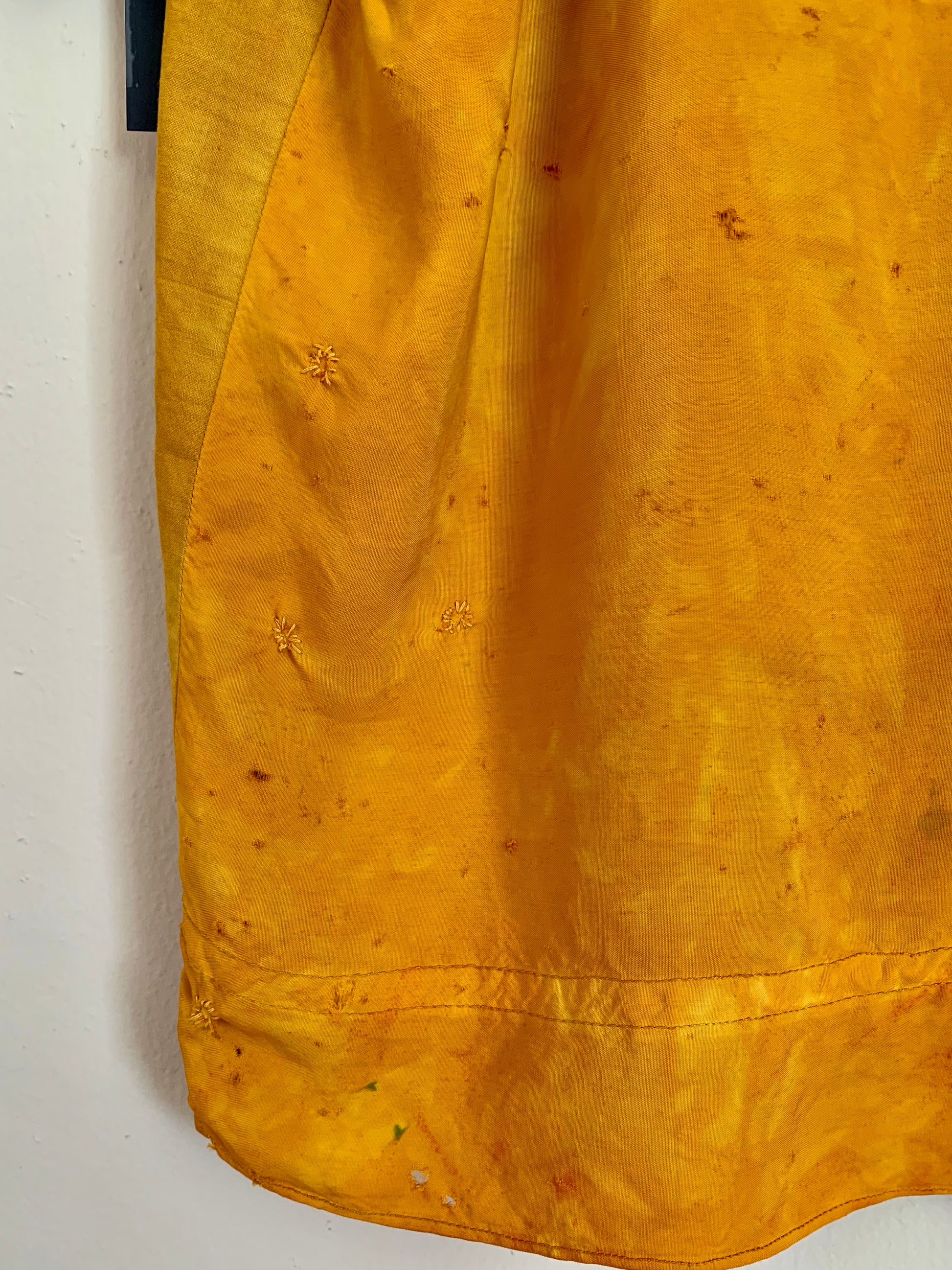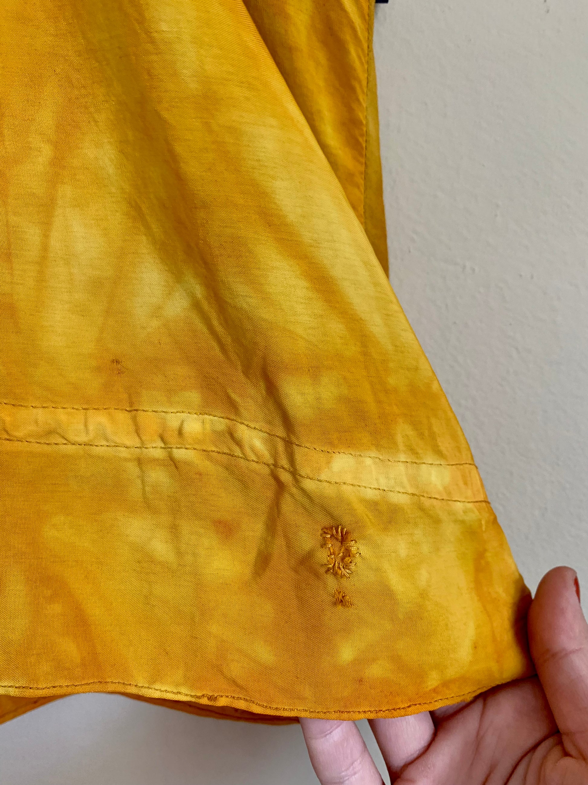 Stunning and bright vintage 30s-40s silk Hungarian embroidered blouse in good vintage condition. When we acquired this blouse, it was cream with stains that would not come out. We dyed it a beautiful marbled marigold with a mid-century Putnam dye to give it a new lease on life. Beautiful rainbow floral embroidery detail throughout. No zippers or buttons, just slips over the head. Though in very wearable condition, does have a somewhat delicate quality that requires care when putting on or taking off. There are several small pinholes, most noticeable on the back. We darned up the largest ones. Despite its wounds, this piece presents beautifully.