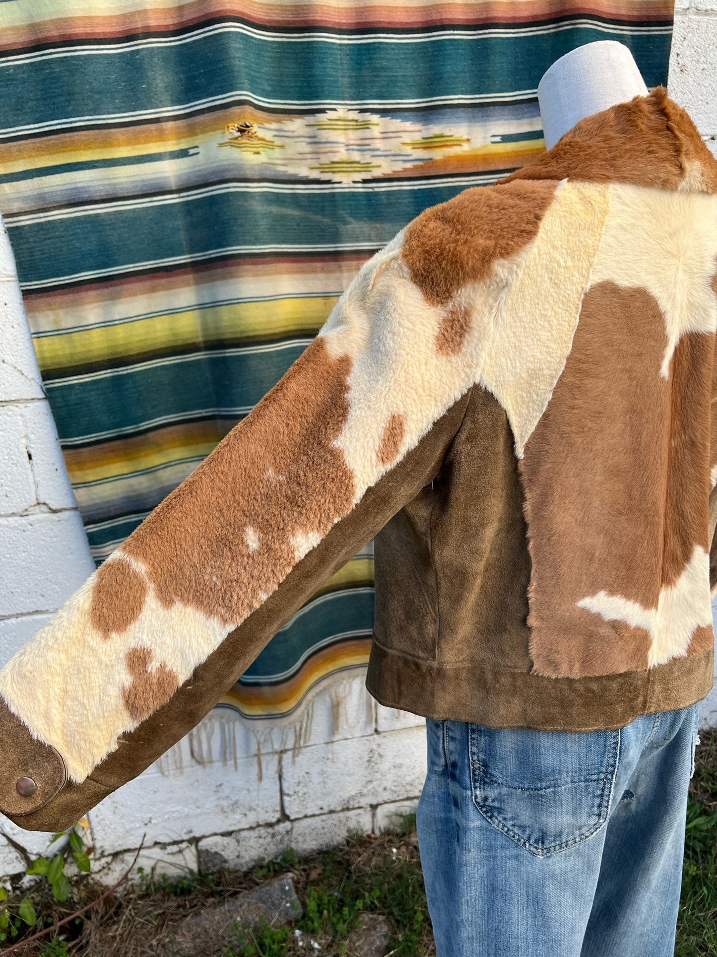 Incredible 1940s hair-on-hide and suede motorcycle jacket. Snap closure. Unique metal horsebit closure at waist. Super rare!