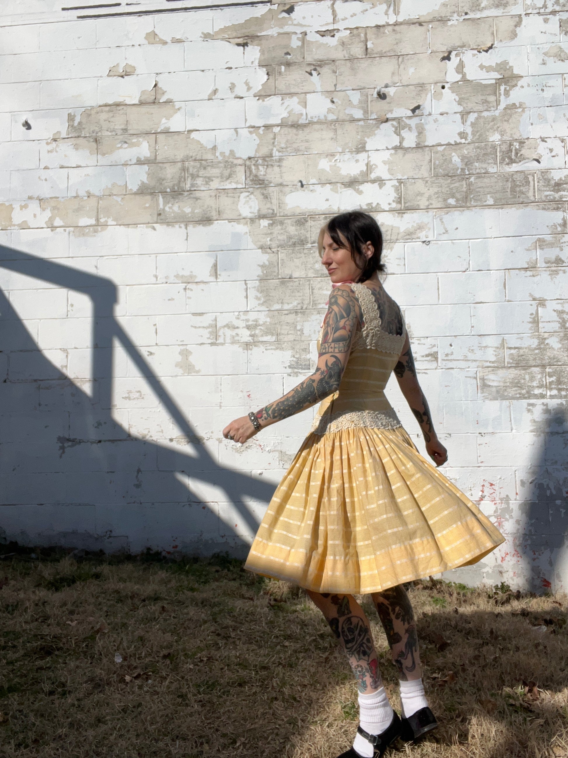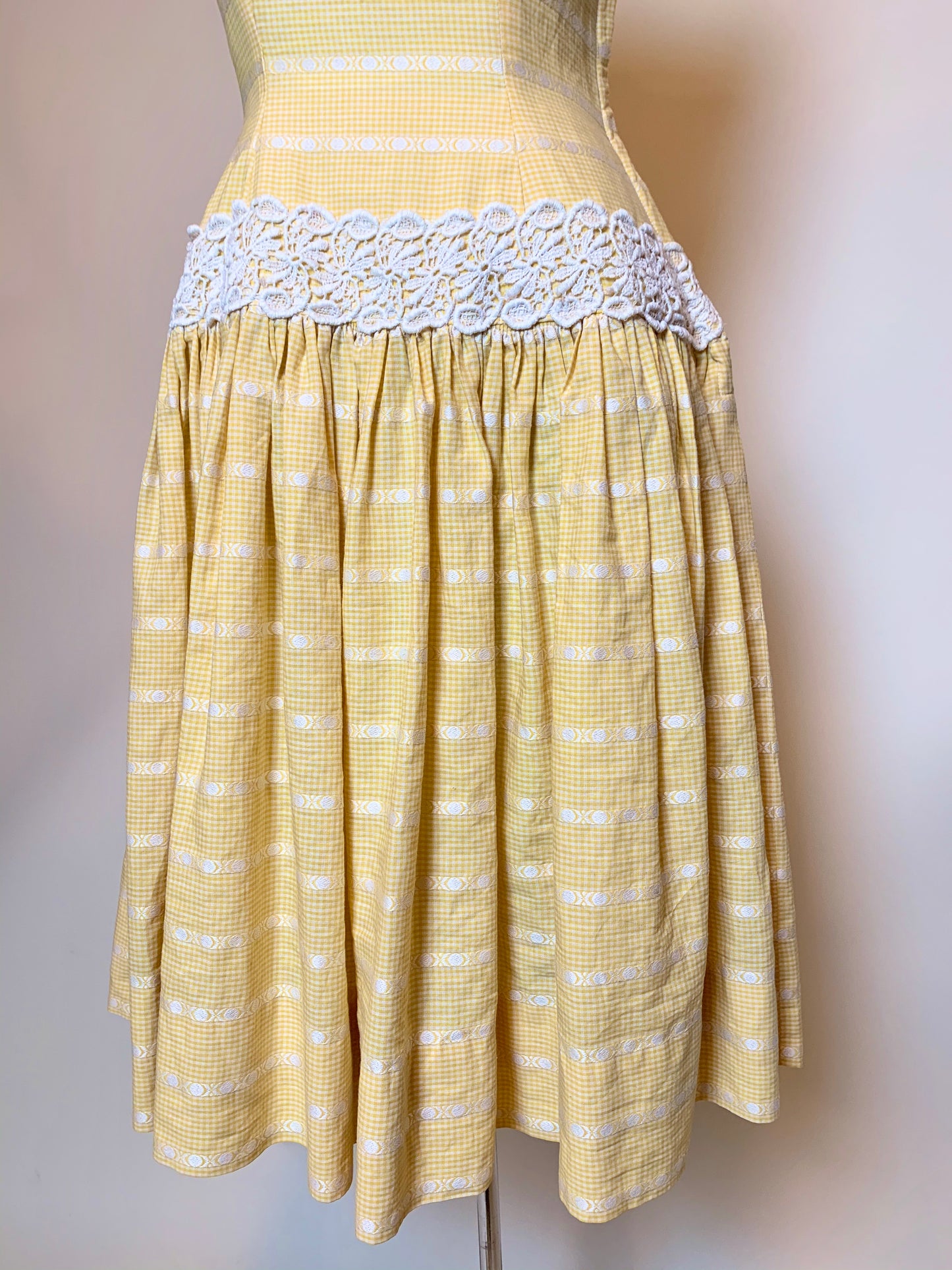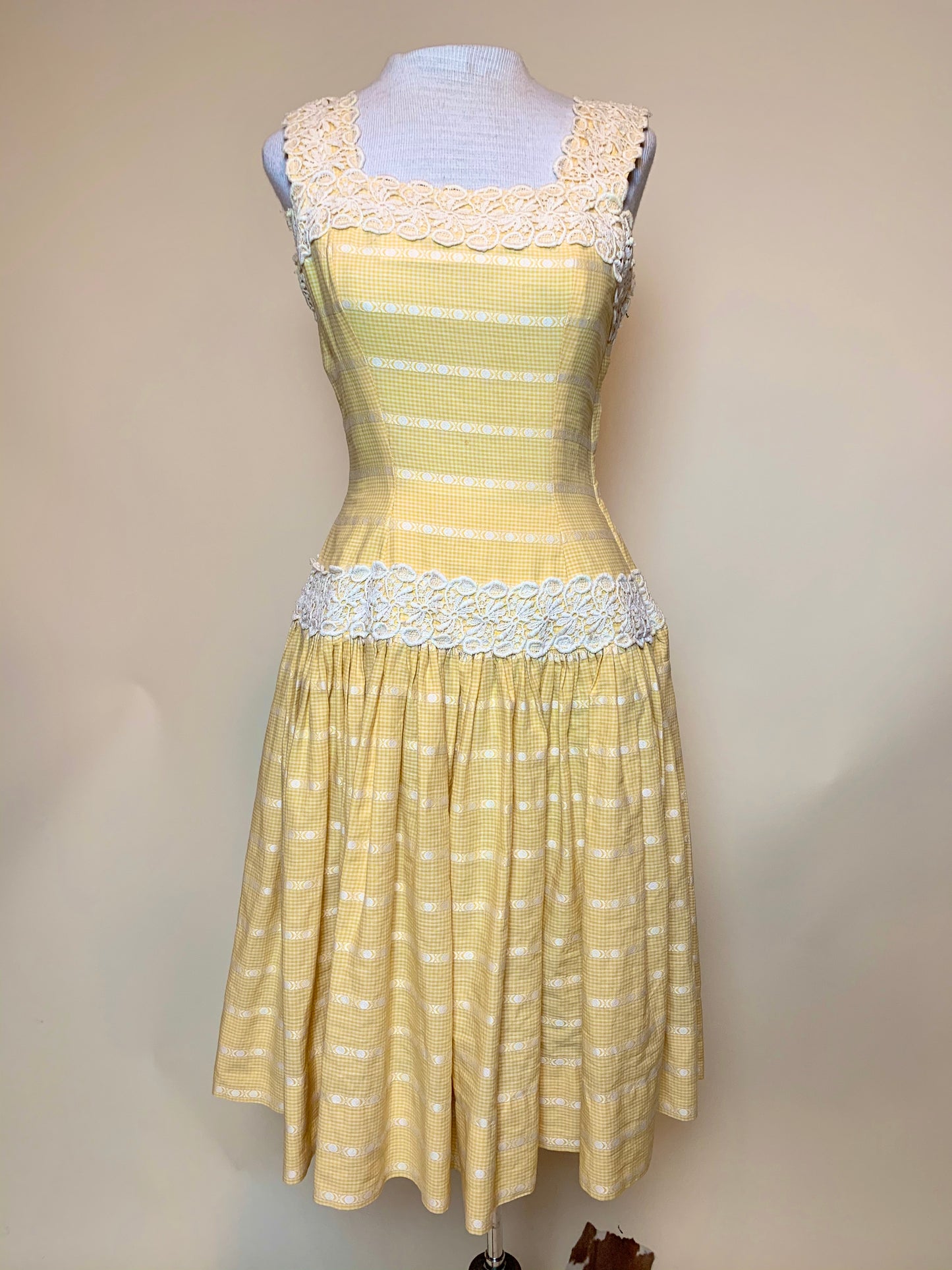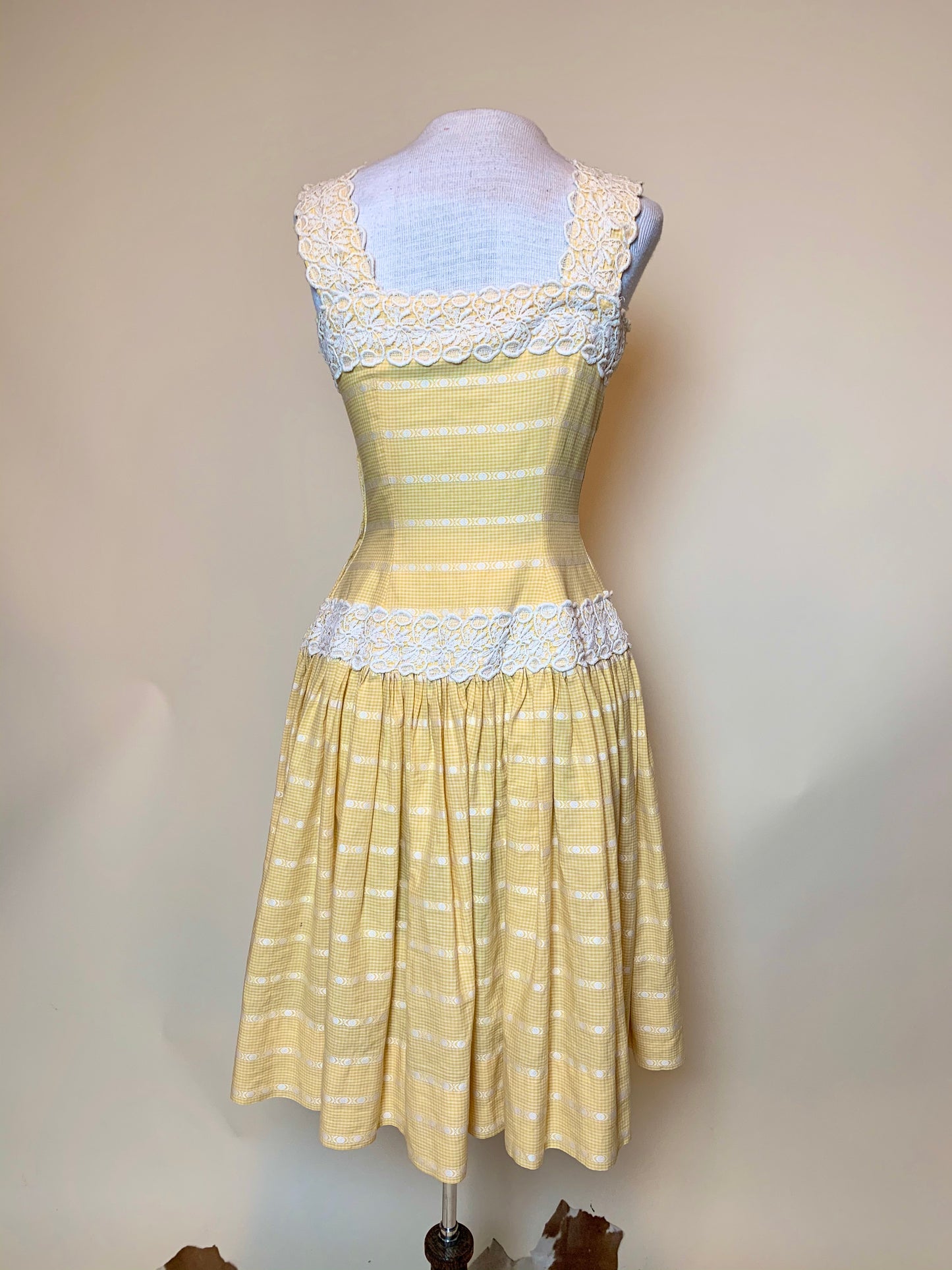 Beautiful curve-hugging 1950s marigold & lace dress. Fitted through the bodice with a lovely full skirt. This dress best accentuates a body with a smaller waist and curvy hips. Material is lightweight and feels similar to rayon. Zips on the side. There is one break in the lace on the shoulder, as pictured.