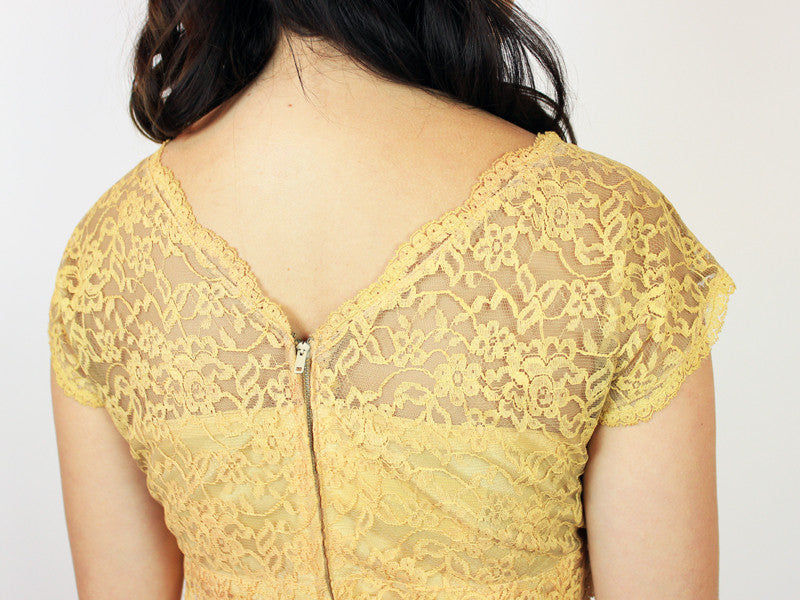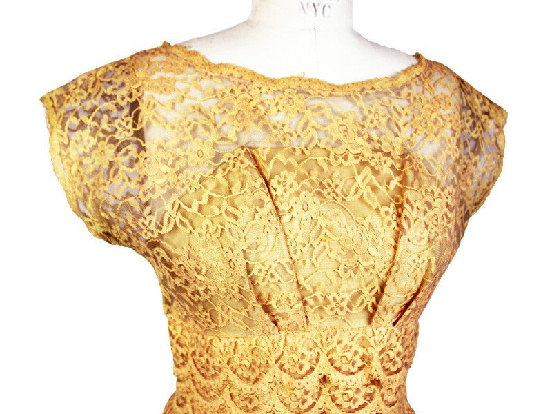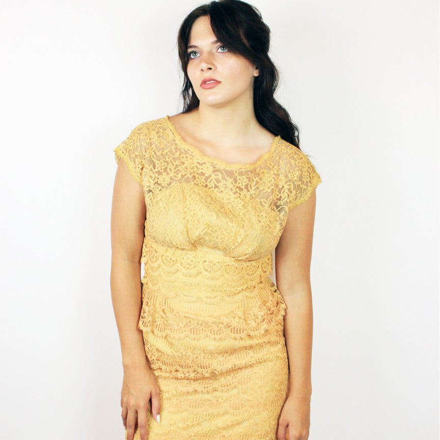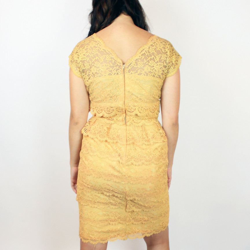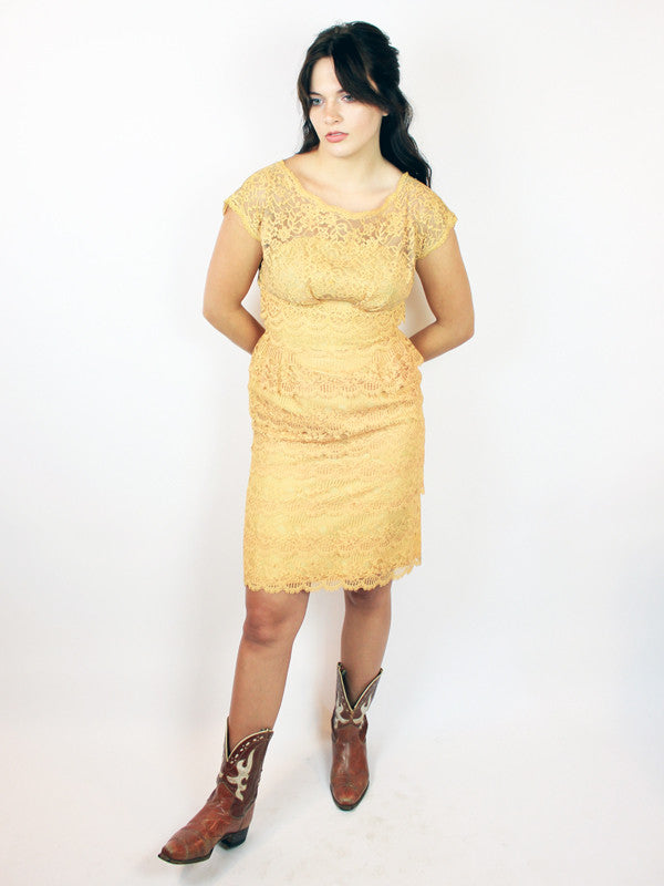 Gorgeous 1950s peach lace dress with silk lining. There is 2 inches of loose stitching under the left armpit but otherwise in great condition.