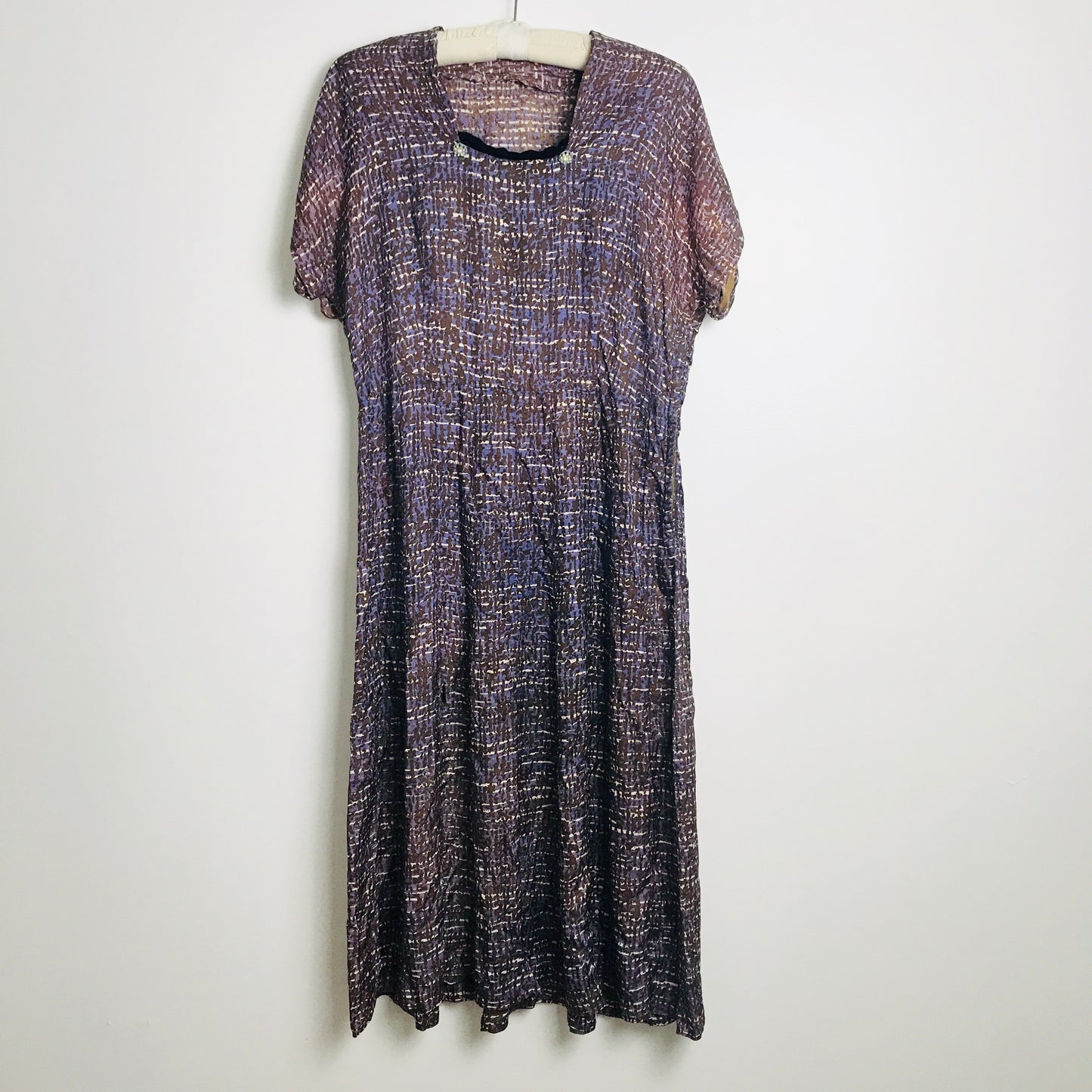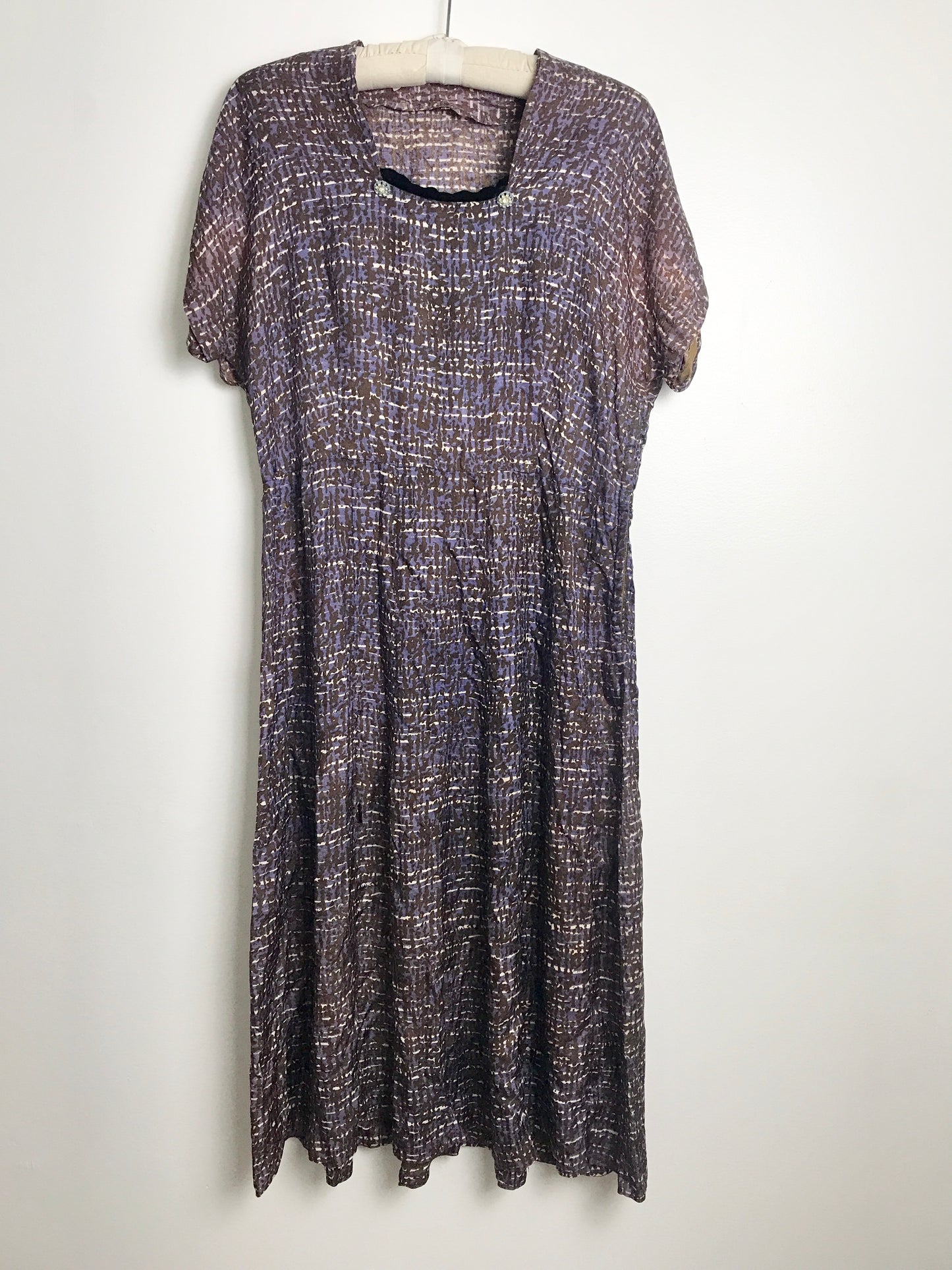 Beautiful, hand stitched dress. Perfect piece of the period, has beautifully faded over time from the sun. Few minor blemished including small hole in fabric along the waistline. Hole/rip front left about 15" above bottom seam. Hole around the left side of waist. Working zipper, comfortable and breathable material. Rhinestones missing from collar buttons accents.