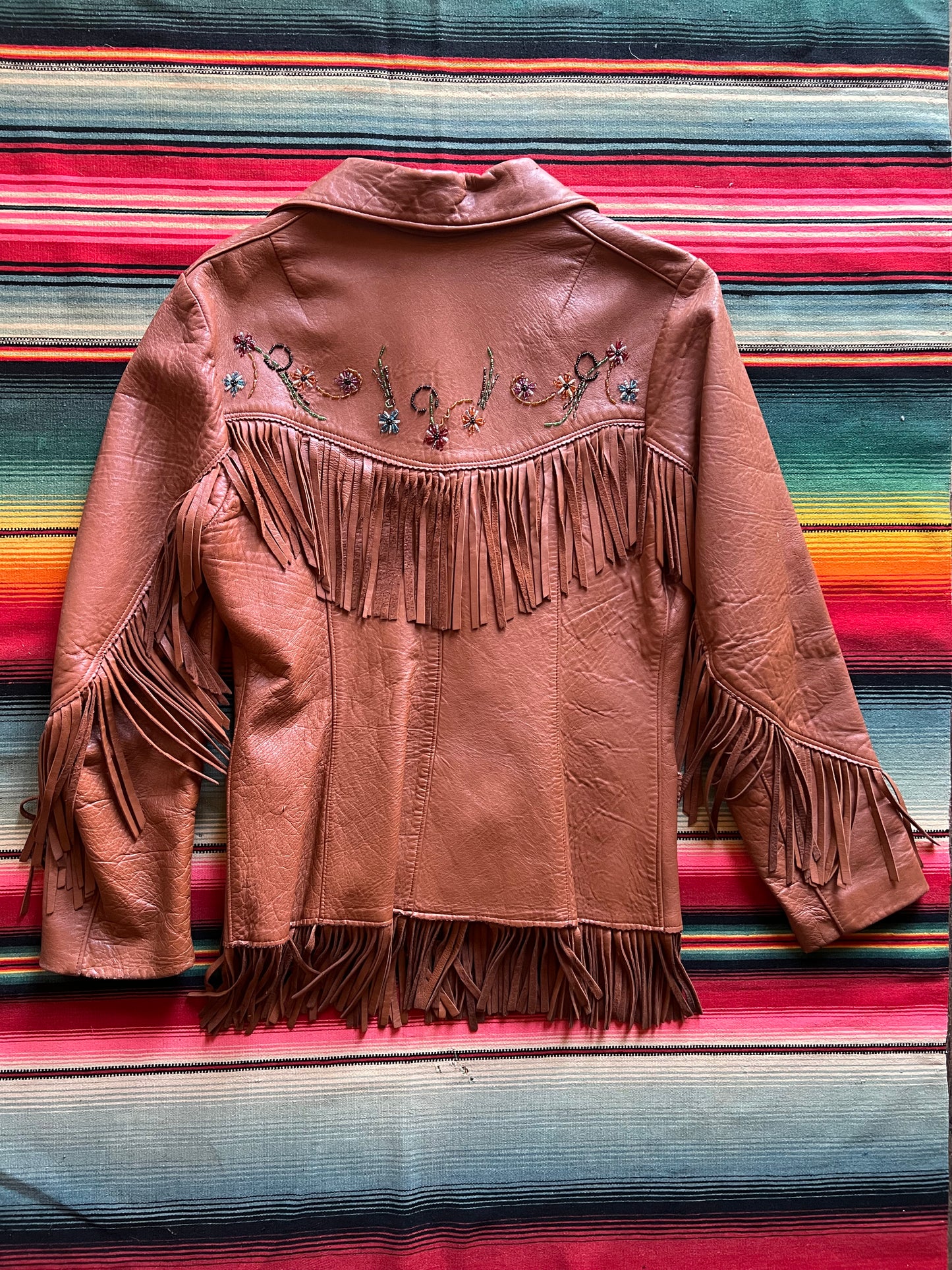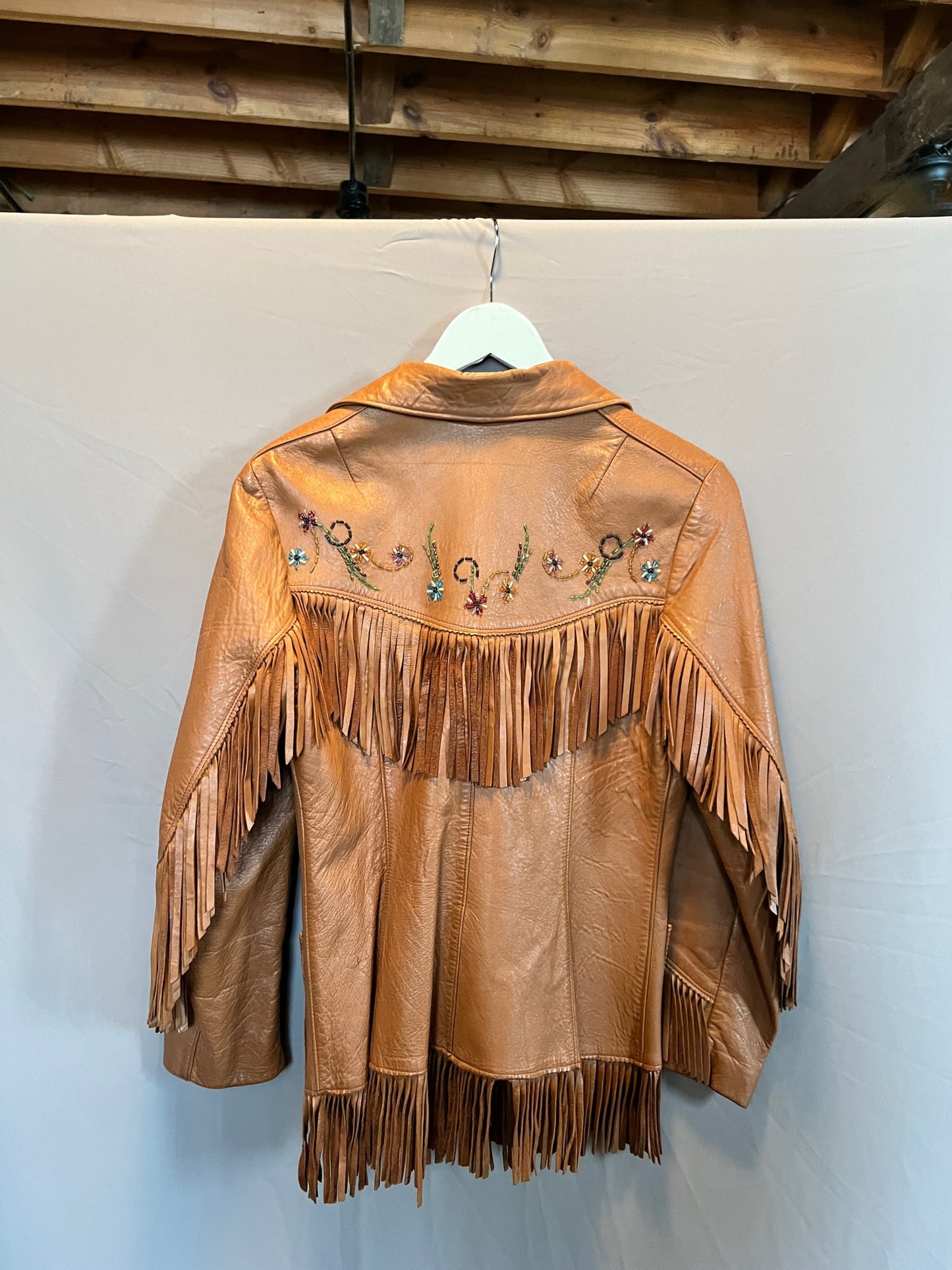 1950s RARE jacket by Chris Line. The perfect leather fringe jacket!!! Mid tone brown deerskin with stunning beaded details. Does have a couple very minor knicks in the leather, see photos. Lining has slight discoloration, but is not seen when worn. In overall good vintage condition.