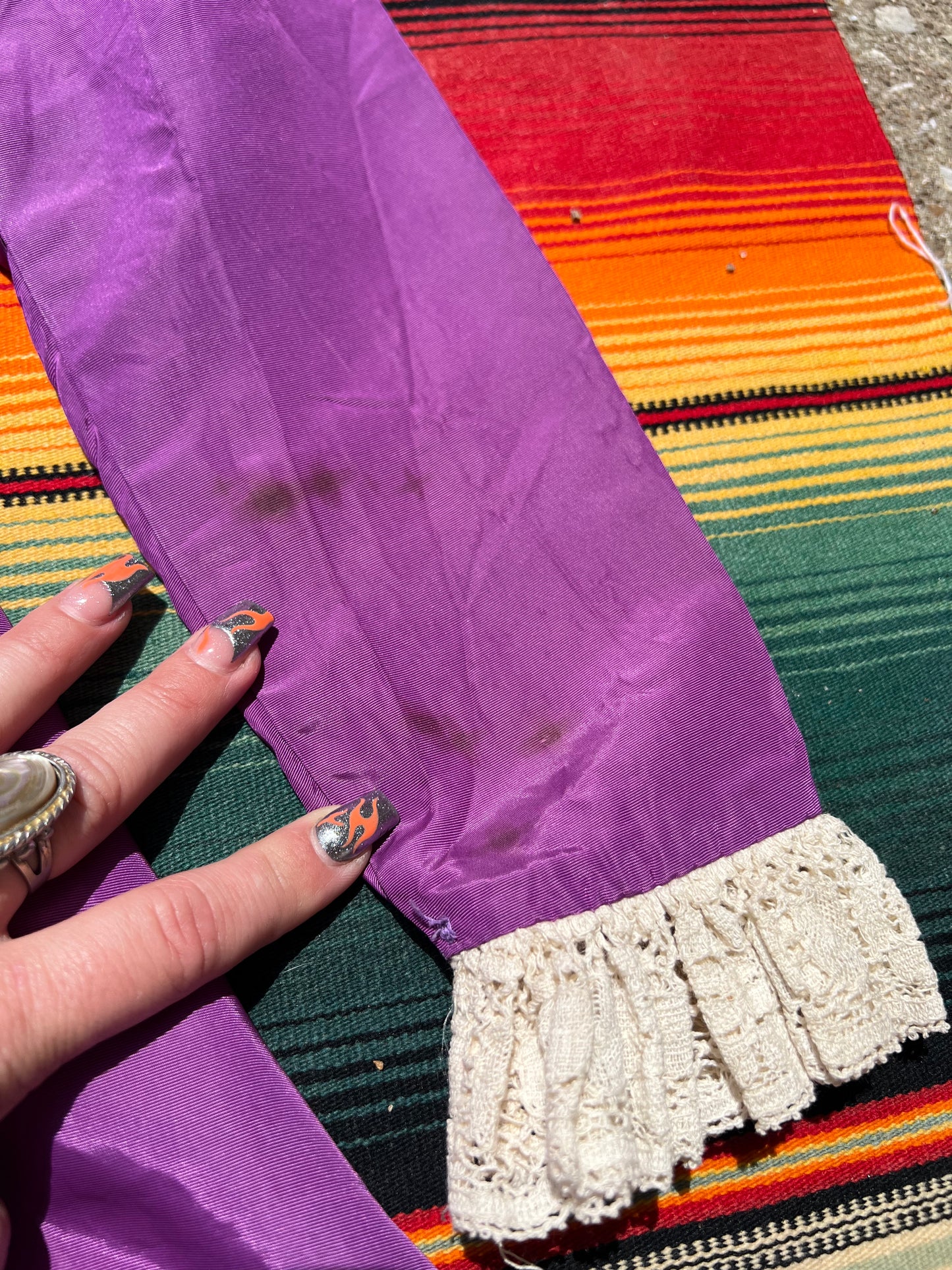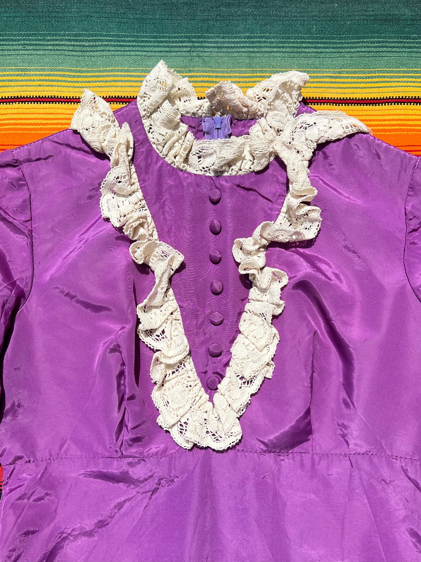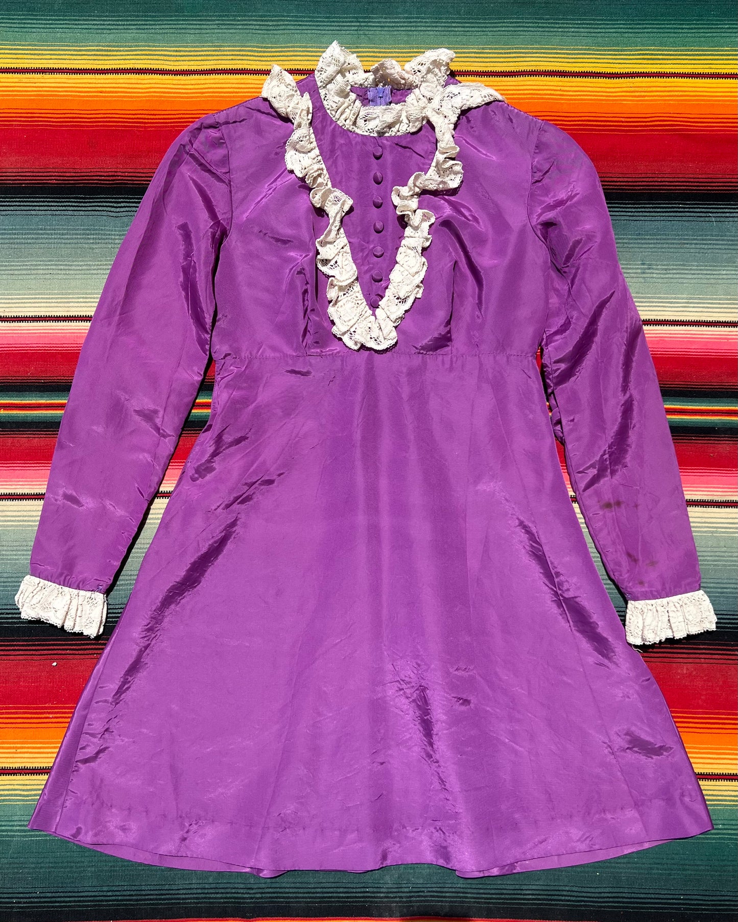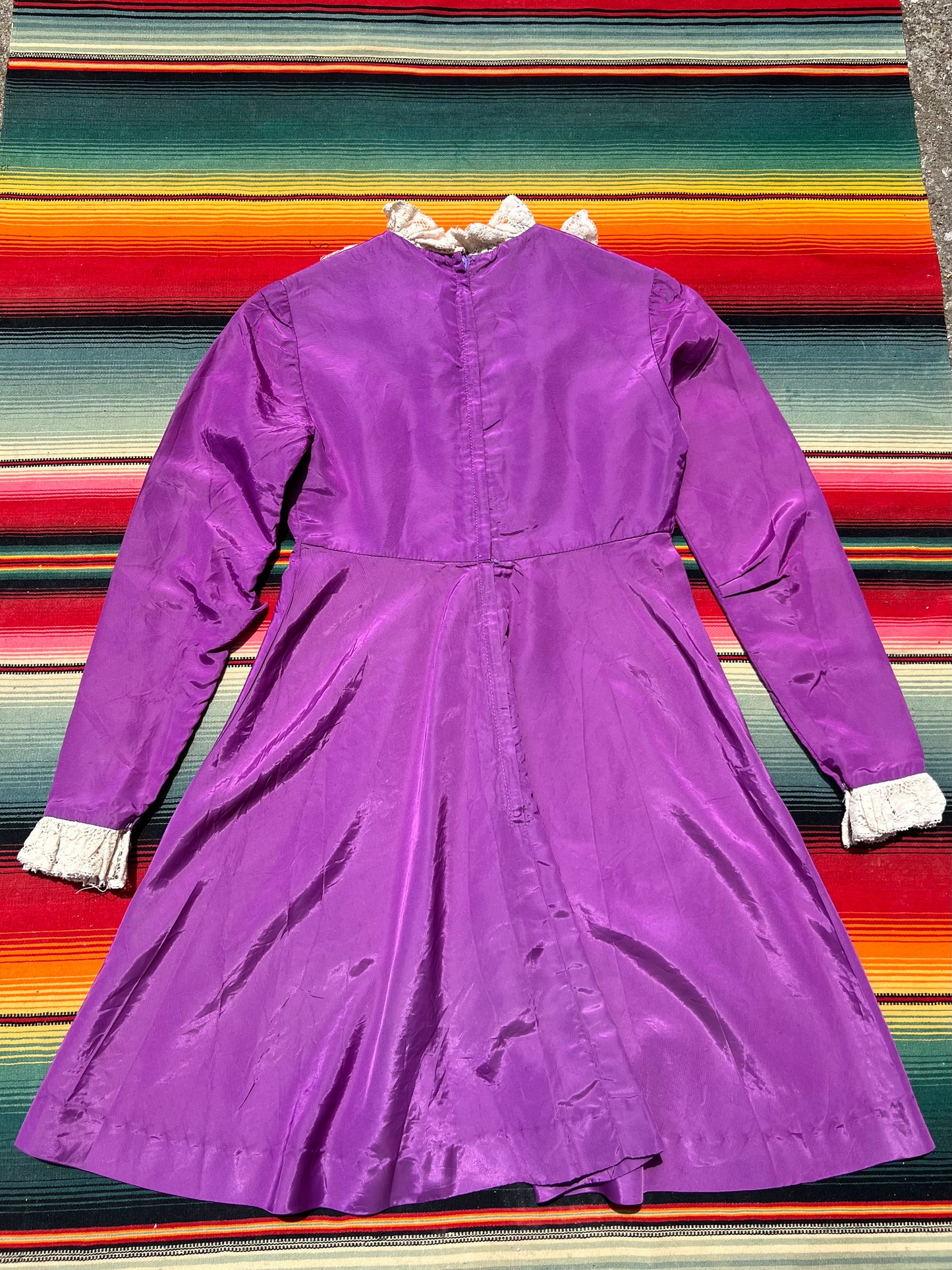 Darling 1960s does Victorian mini dress. Made of purple taffeta with cream lace trim. Hidden back zip closure. There is a ~3 inch seam separation on the left elbow and a few spots on the sleeve near the cuff.