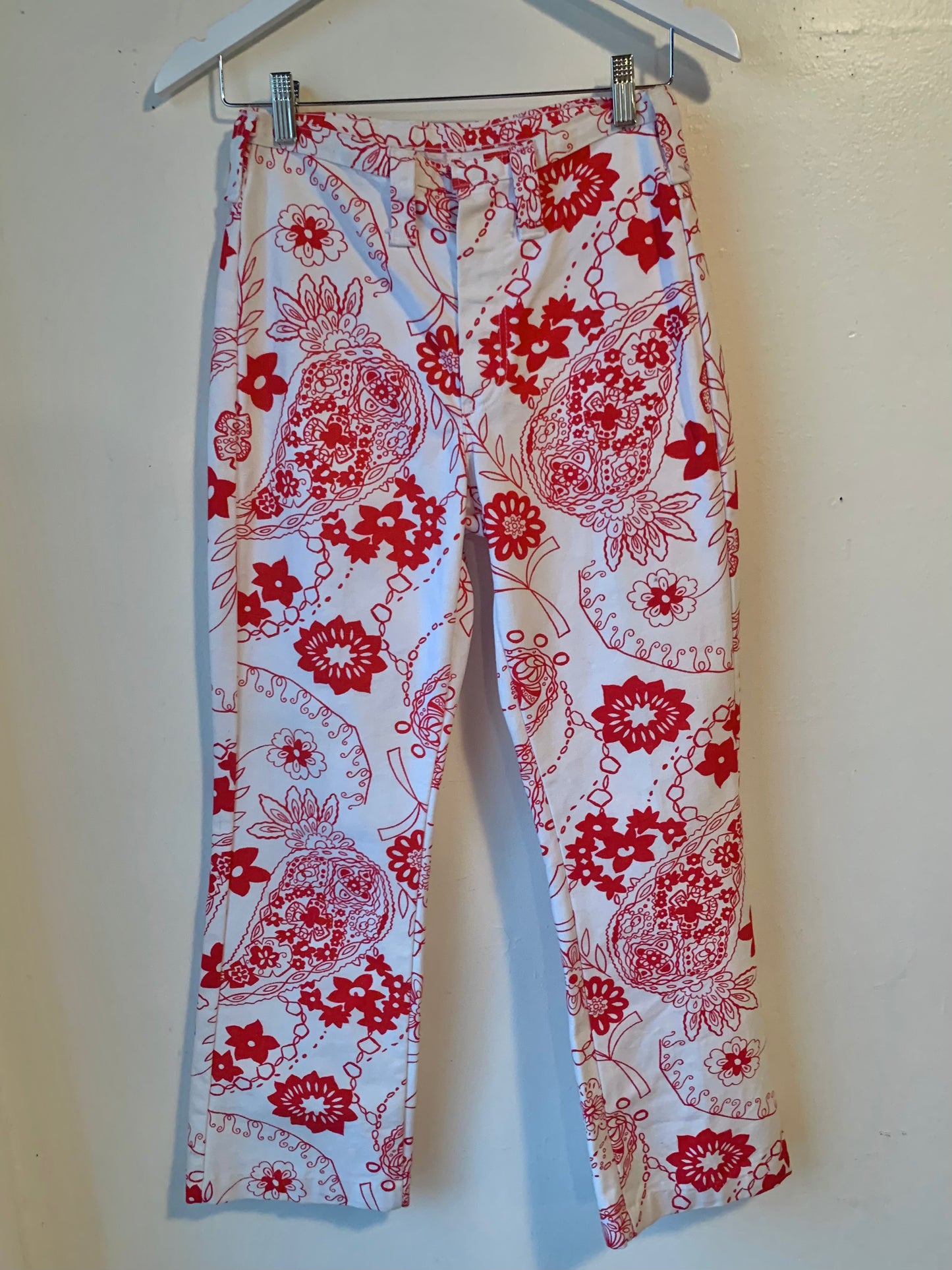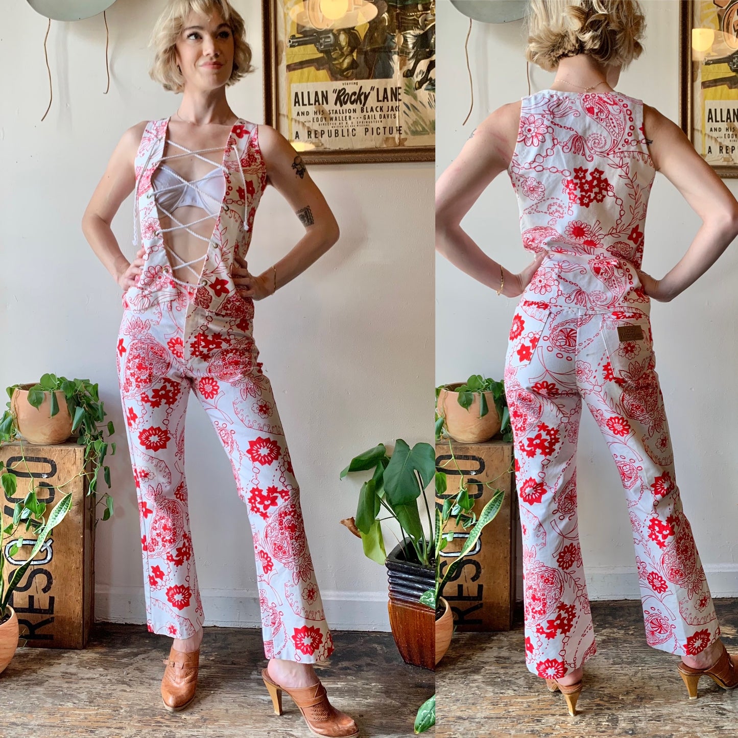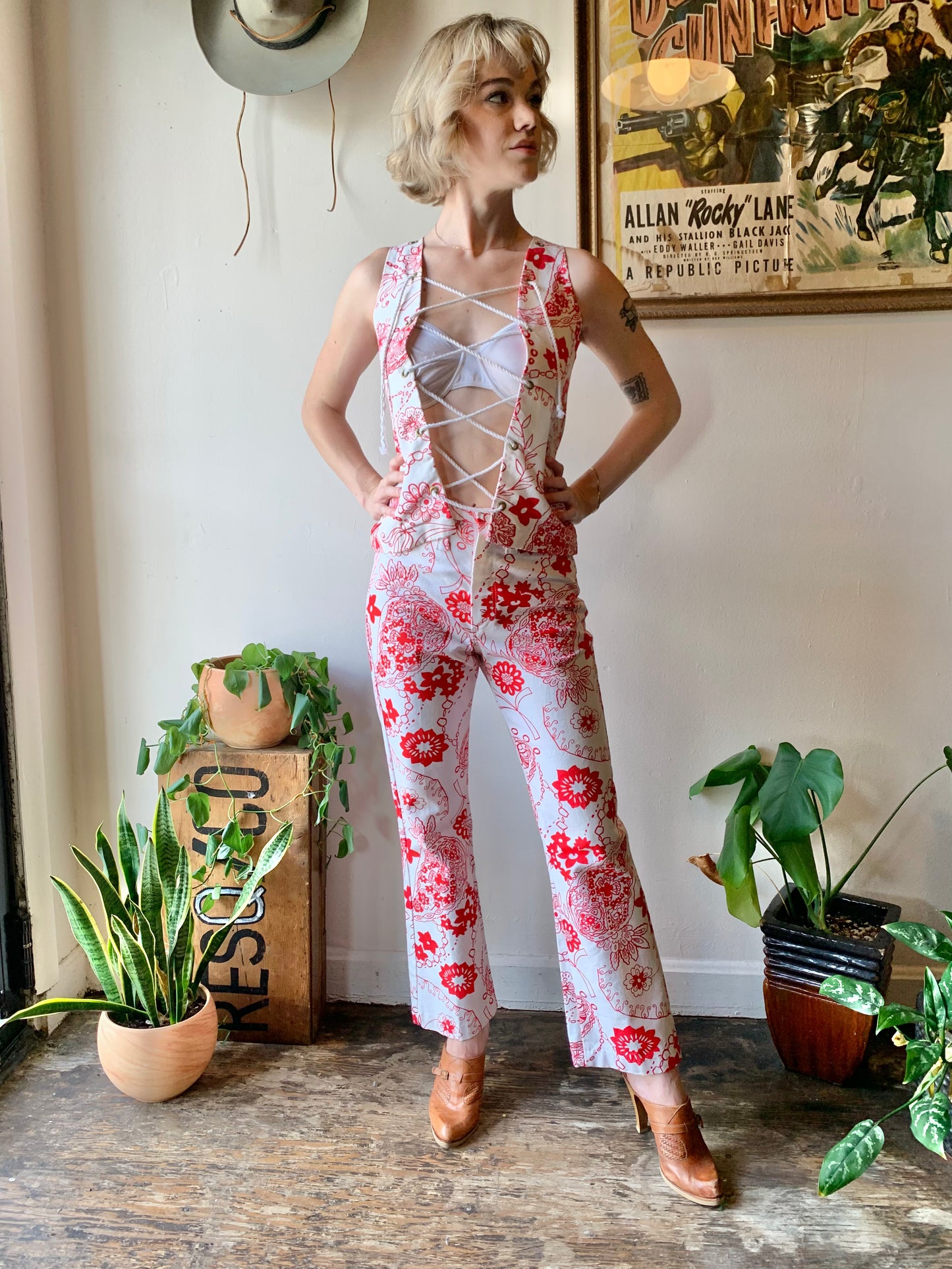 1960s Red & White Floral Grommet 2-pc Pantsuit (XS/S)