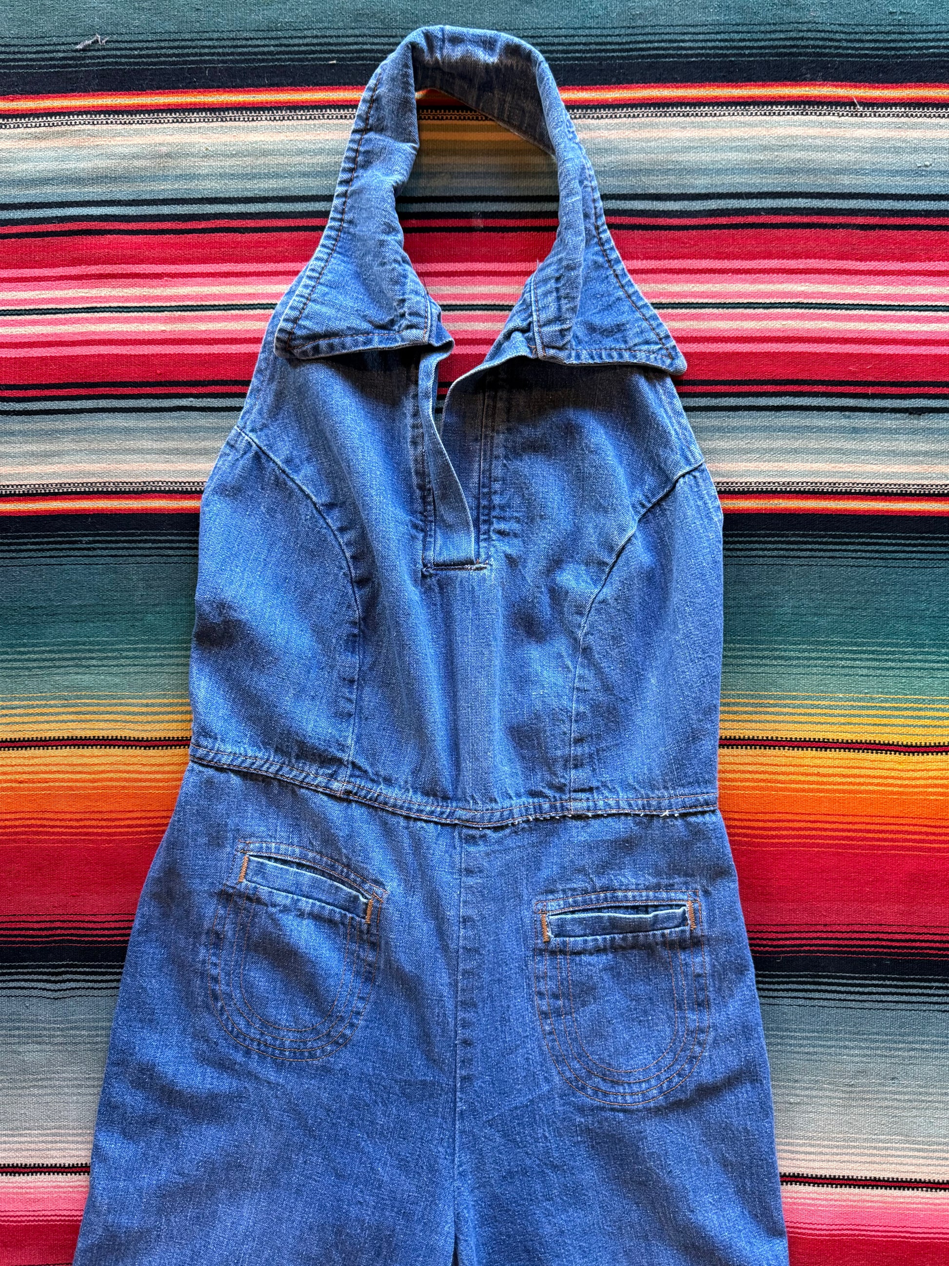 Killer 1970s backless denim wide leg jumpsuit!