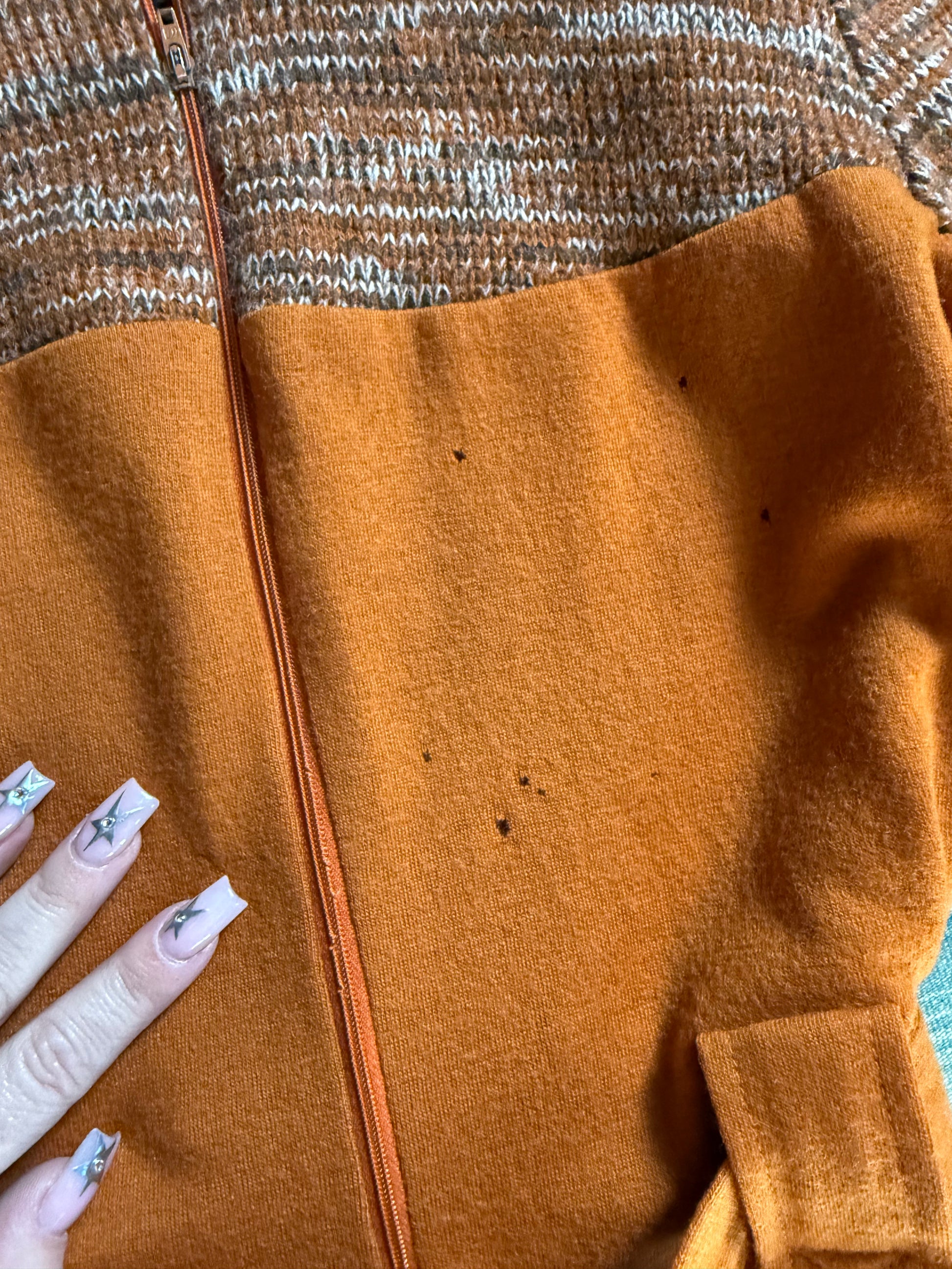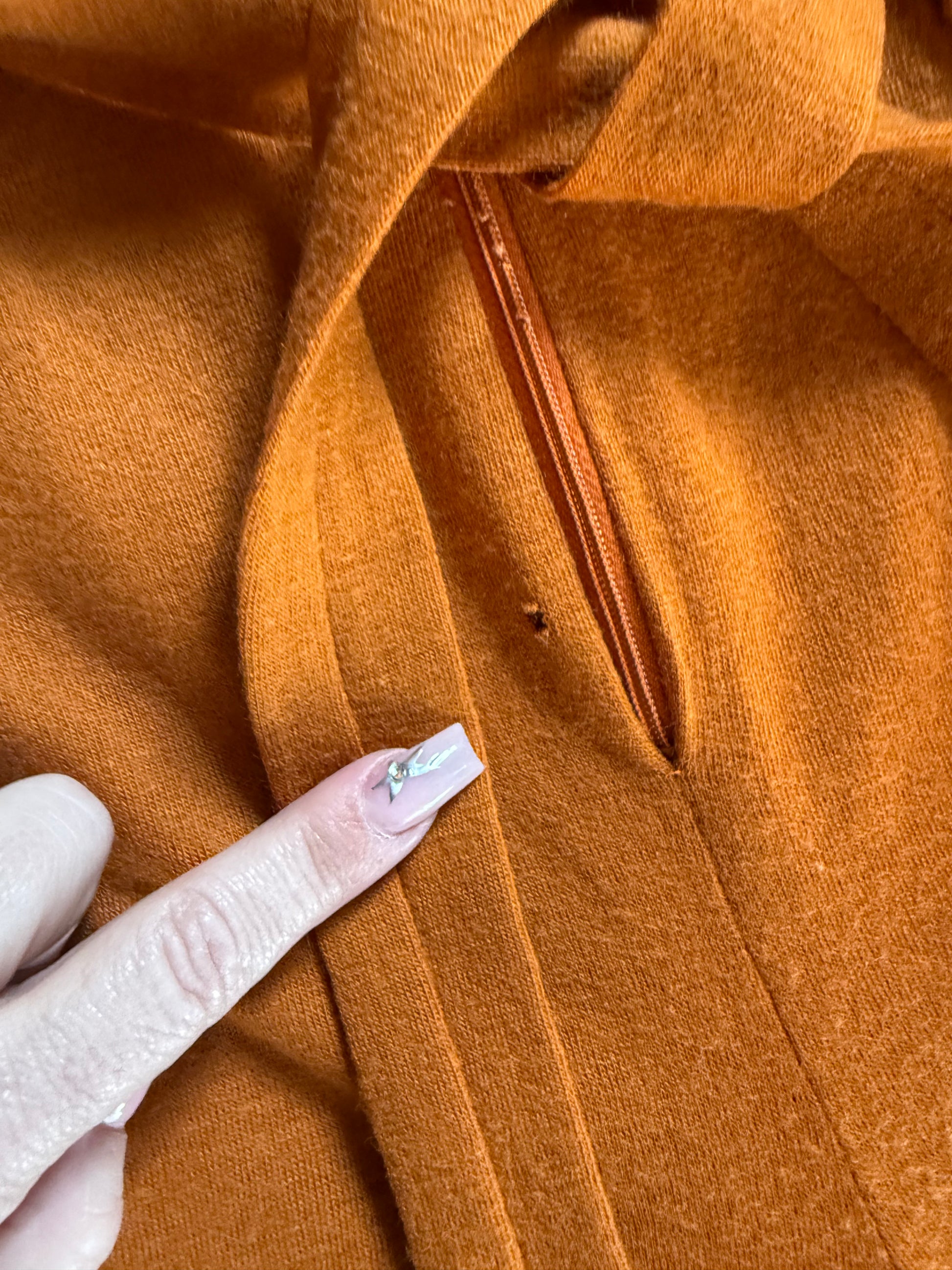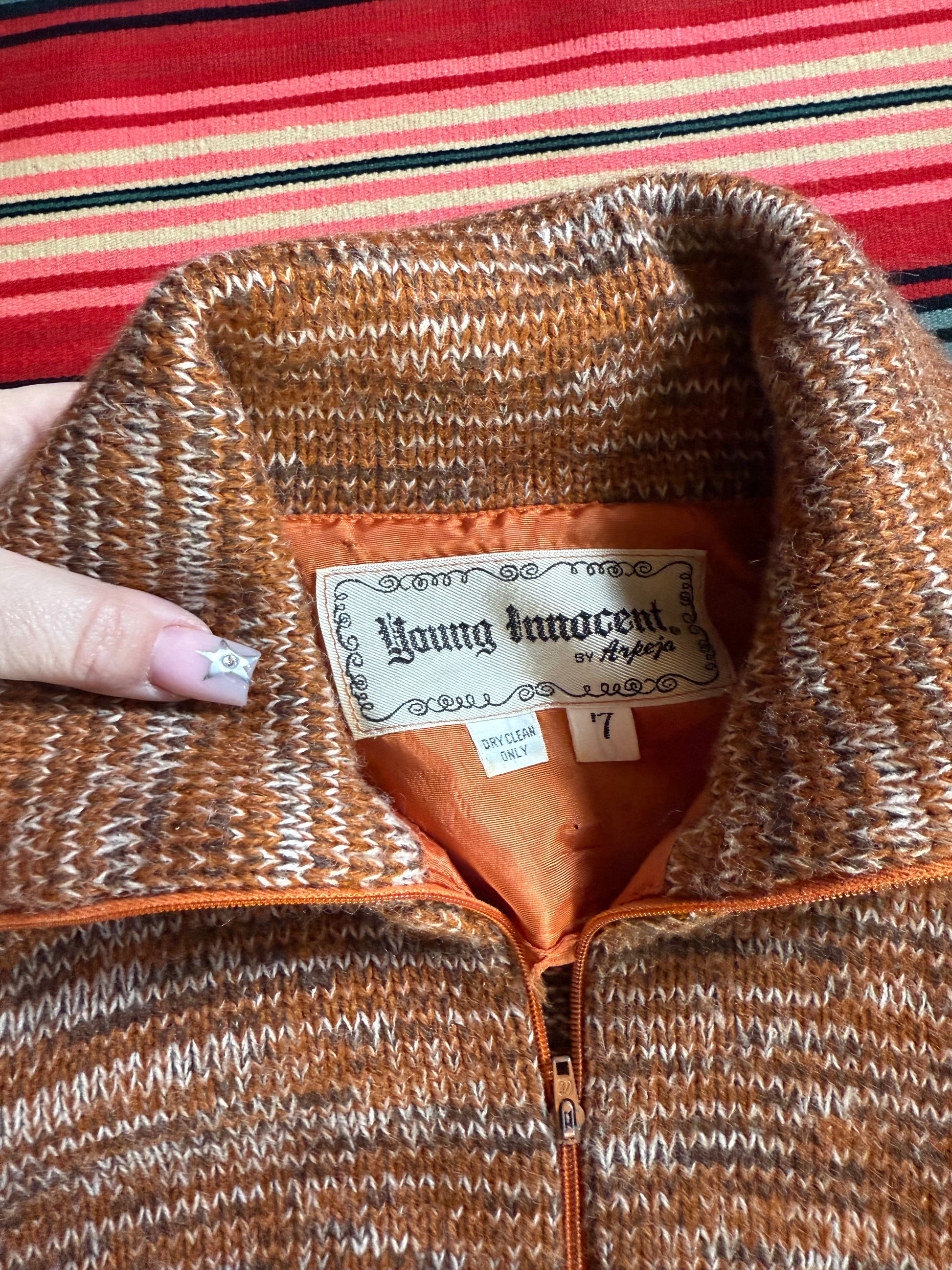 Cozy, curve-hugging 1970s jumpsuit. Knit top, wool-blend body with lots of stretch (not itchy!) in a beautiful rusty neutral color scheme. There are some small scattered holes that could be darned but totally wearable as-is.
