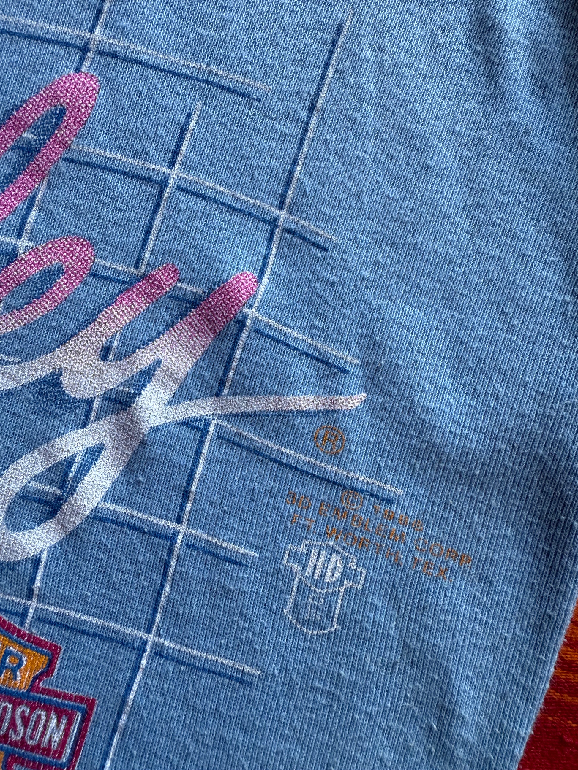 Amazing 1980s lace-trimmed Harley tank in a great sky blue color with a hot pink rose. Lots of stretch!