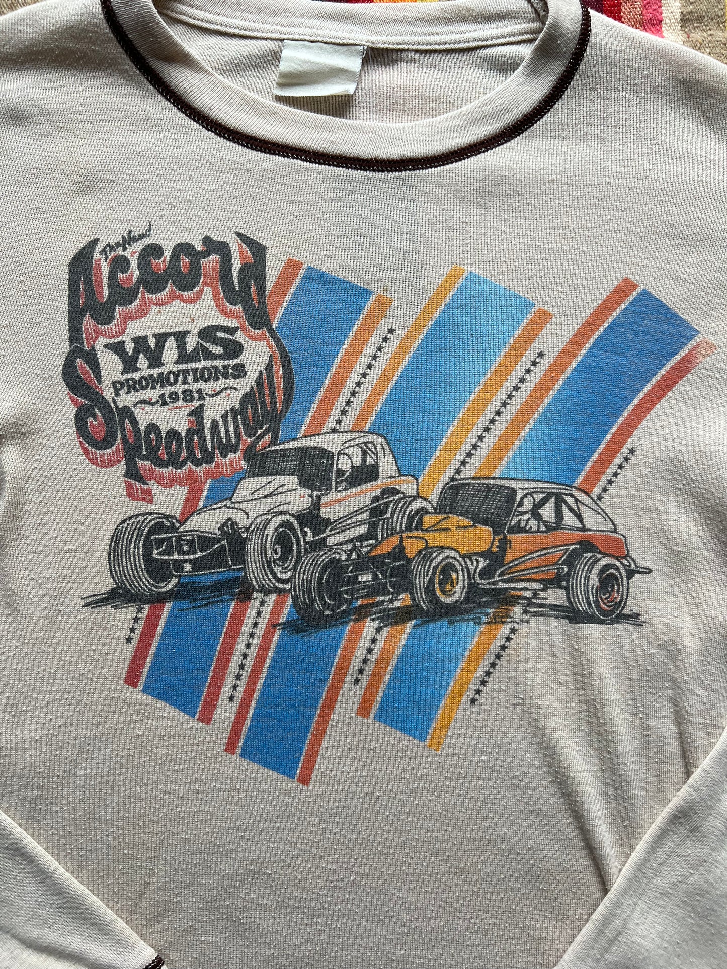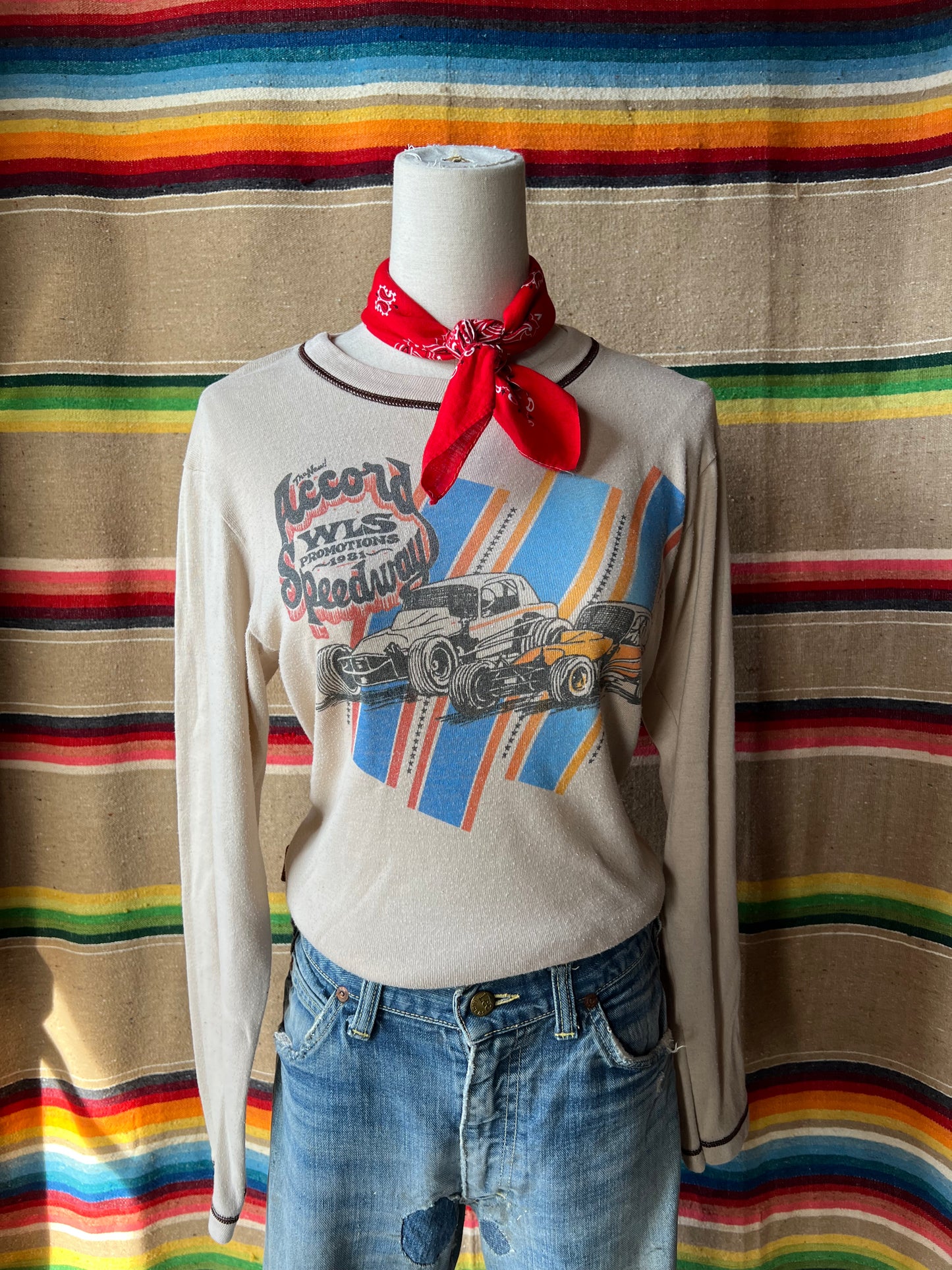 Amazing long sleeve from 1981. Racecar print, pretty neutral color way. Great condition!