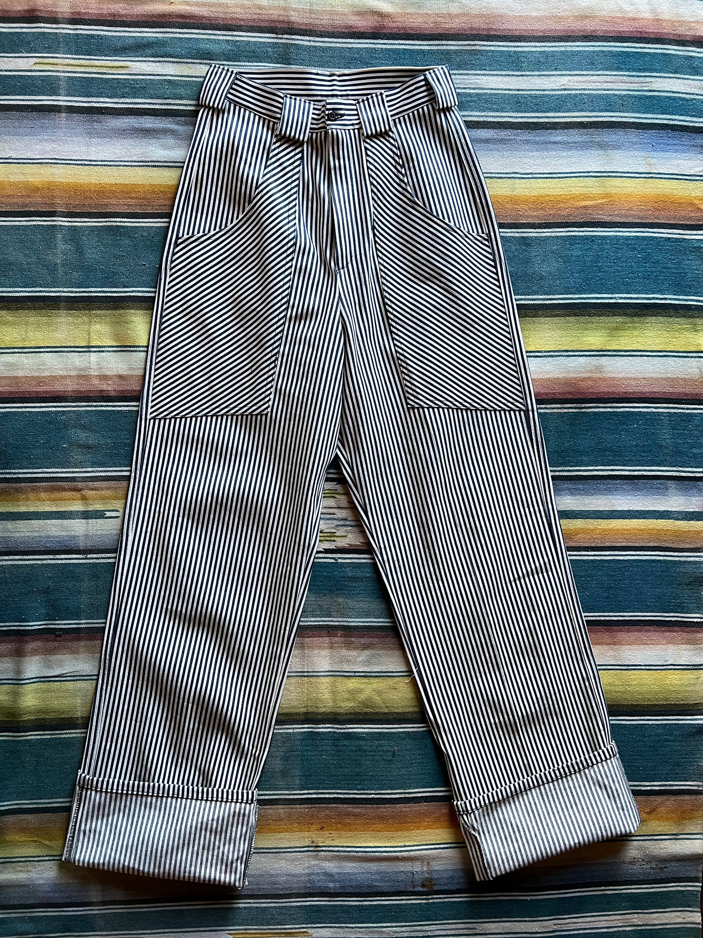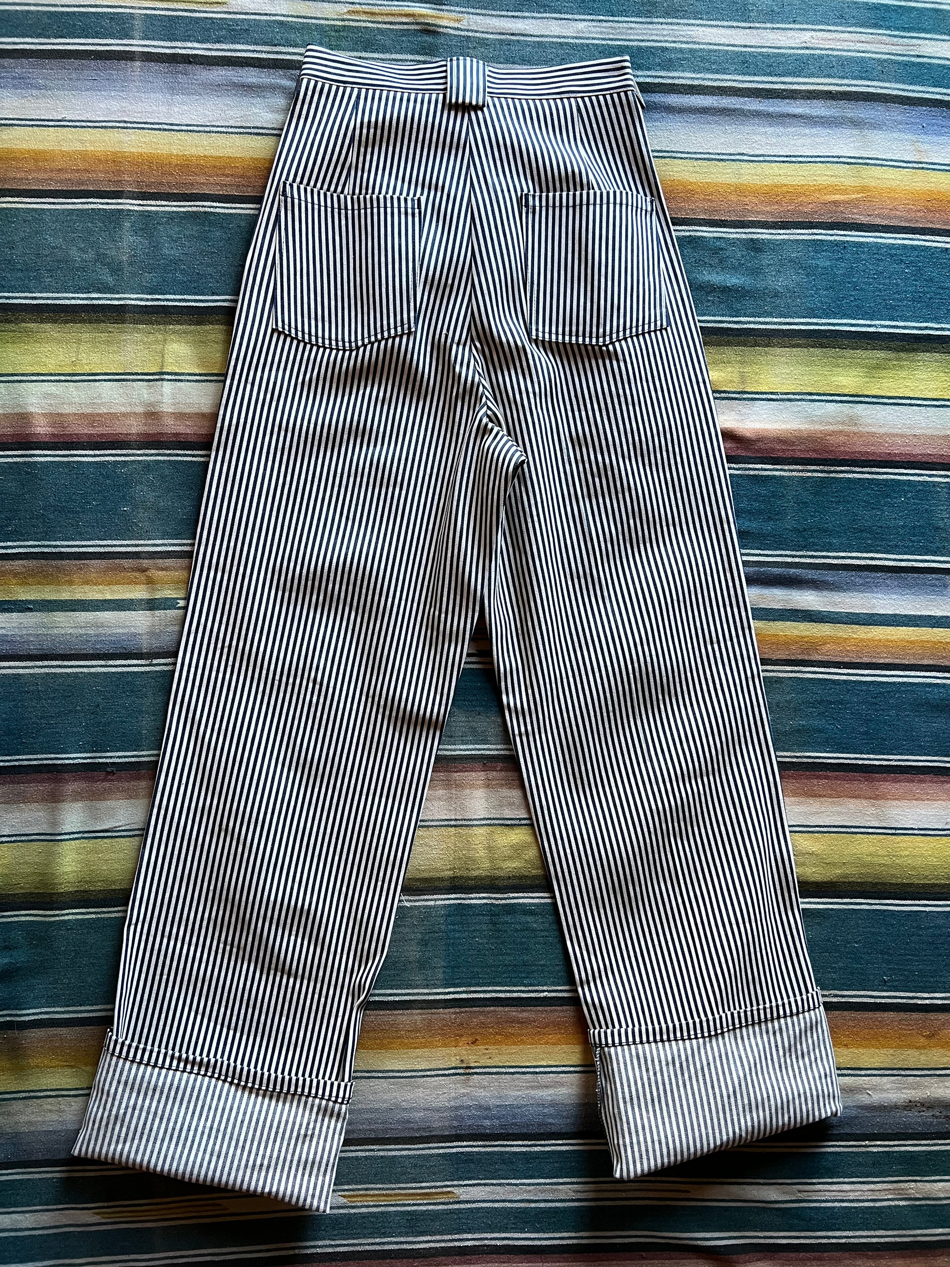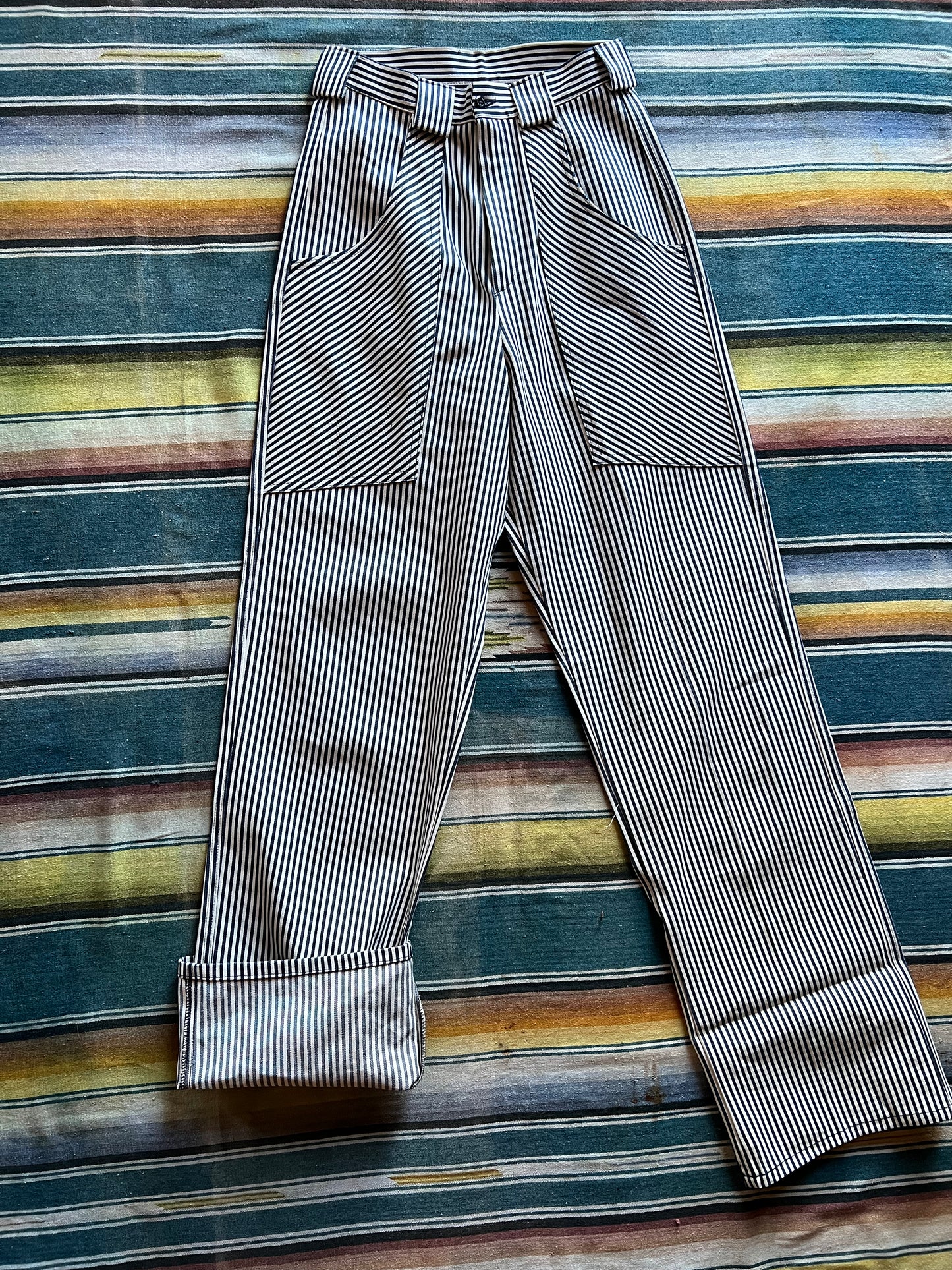 Amazing 1970s hickory stripe railroad uniform pants. Super high rise and super long inseam - great for a tall person but also look cool cuffed!