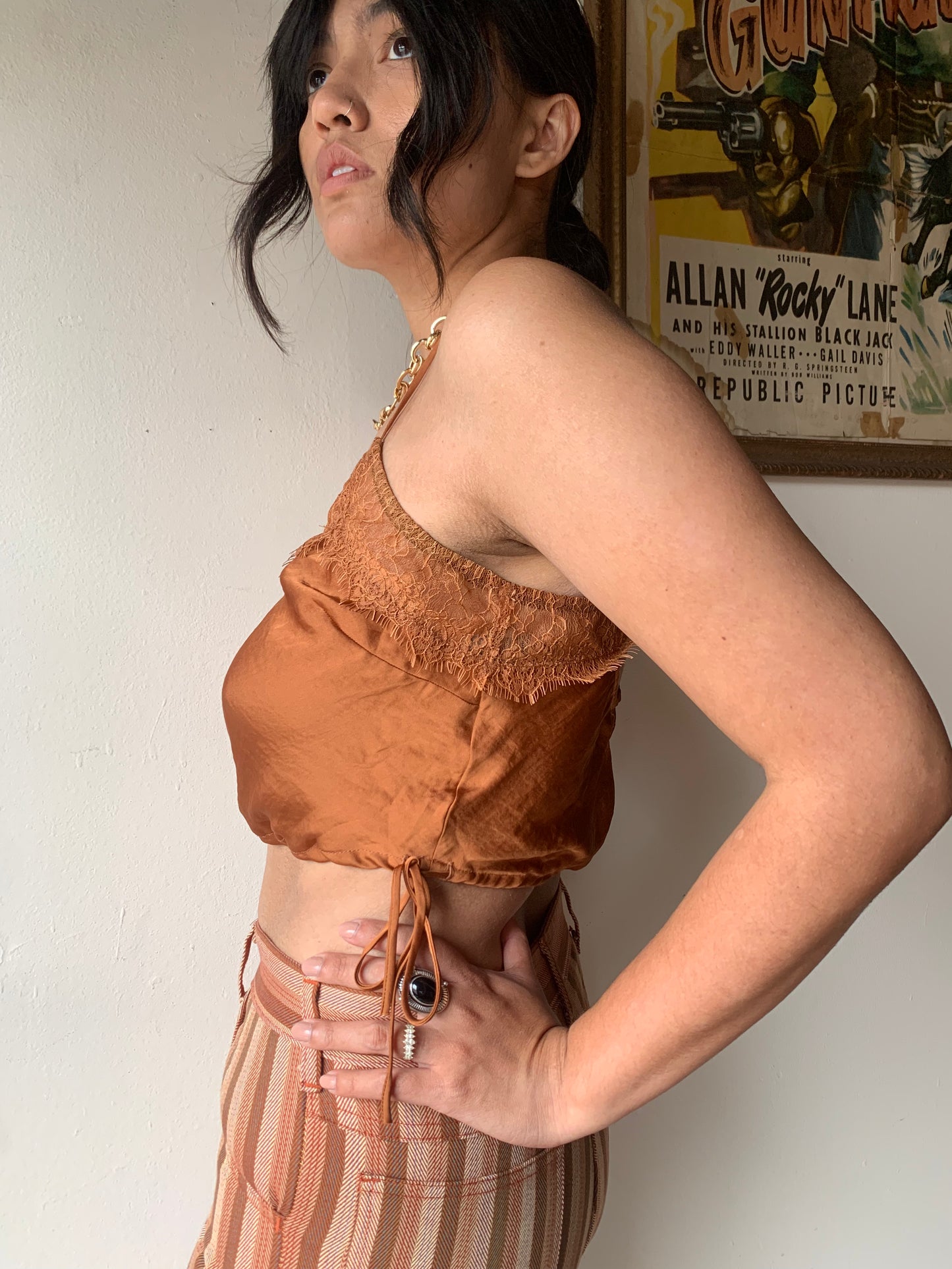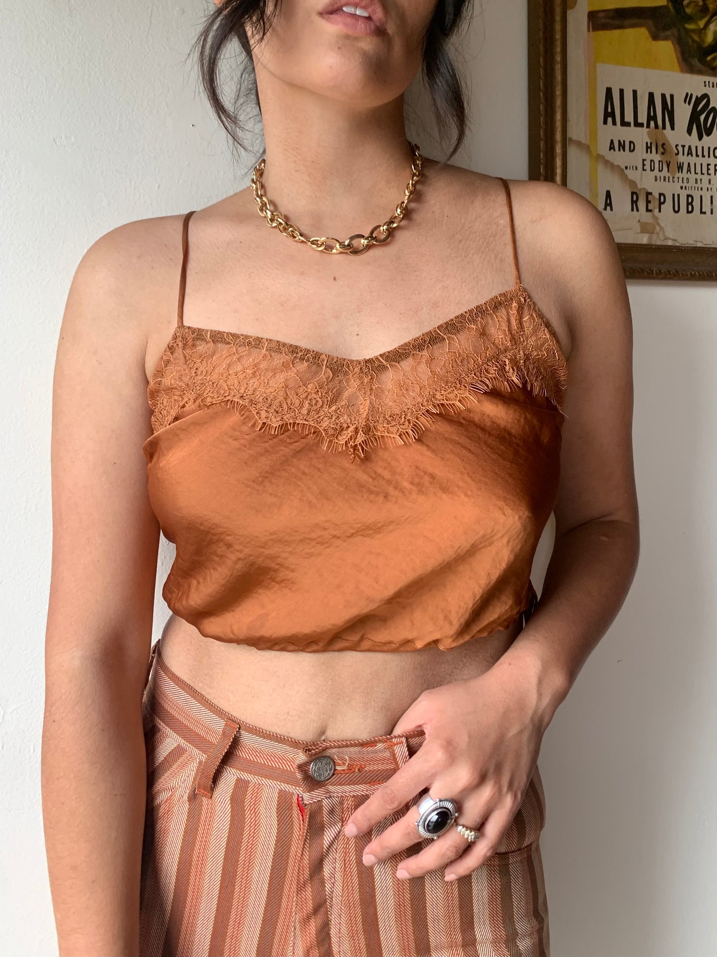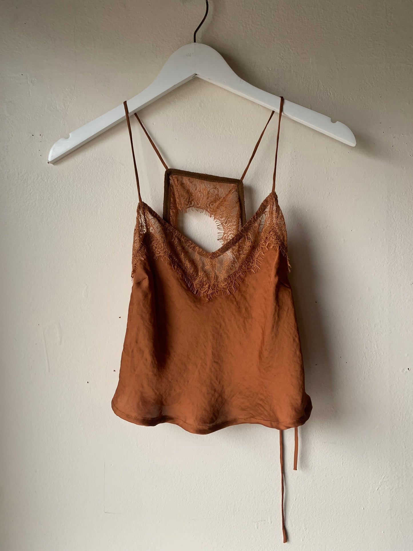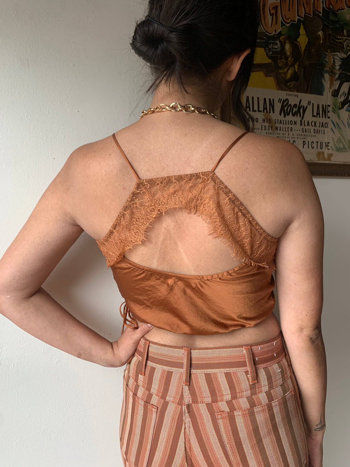 Gorgeous modern camisole! Made of slinky rust colored fabric, with delicate lace trim and a peek-a-boo cut out back. Adjustable tie inside waist.