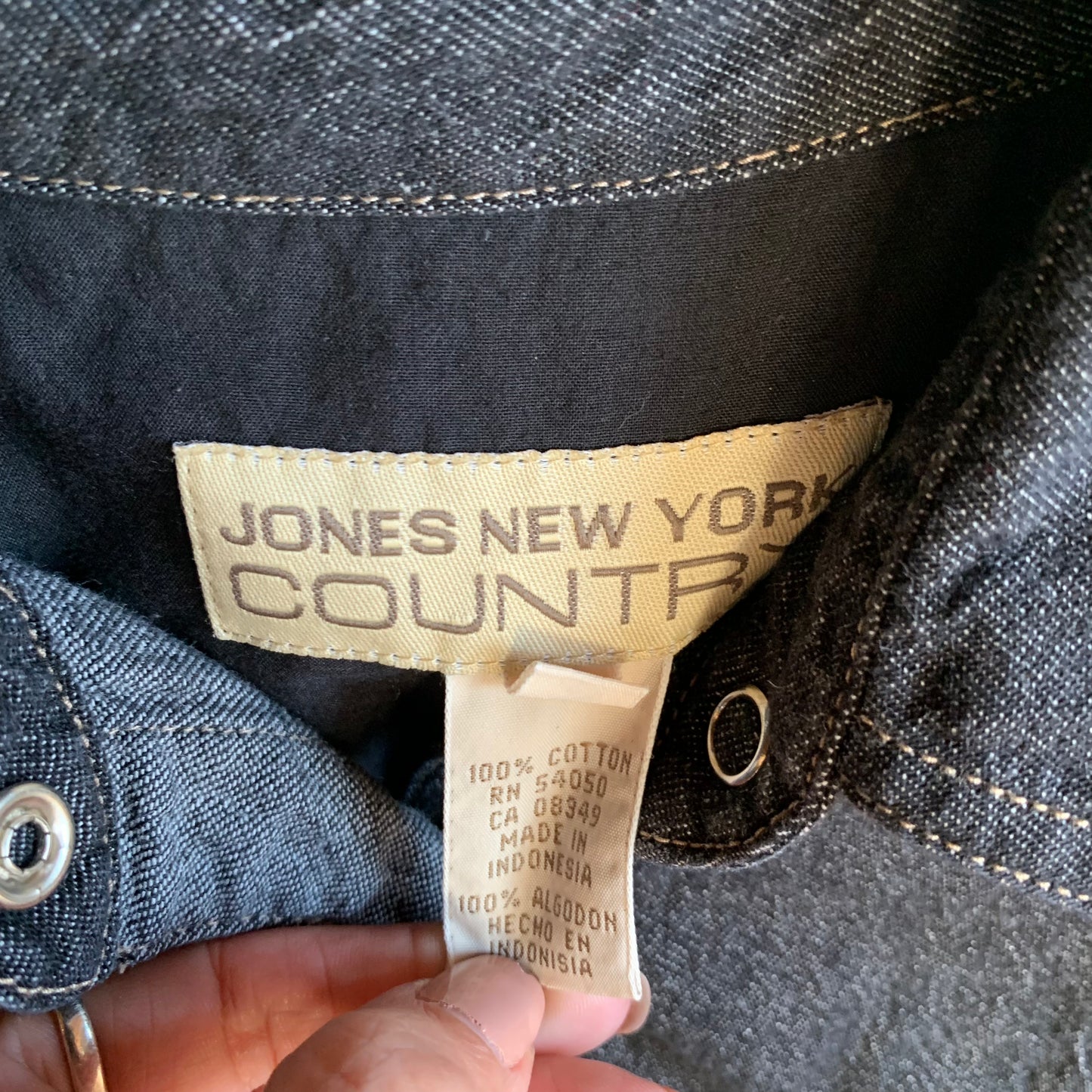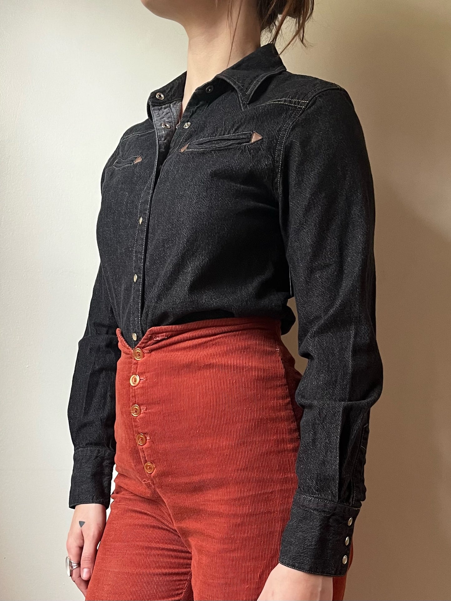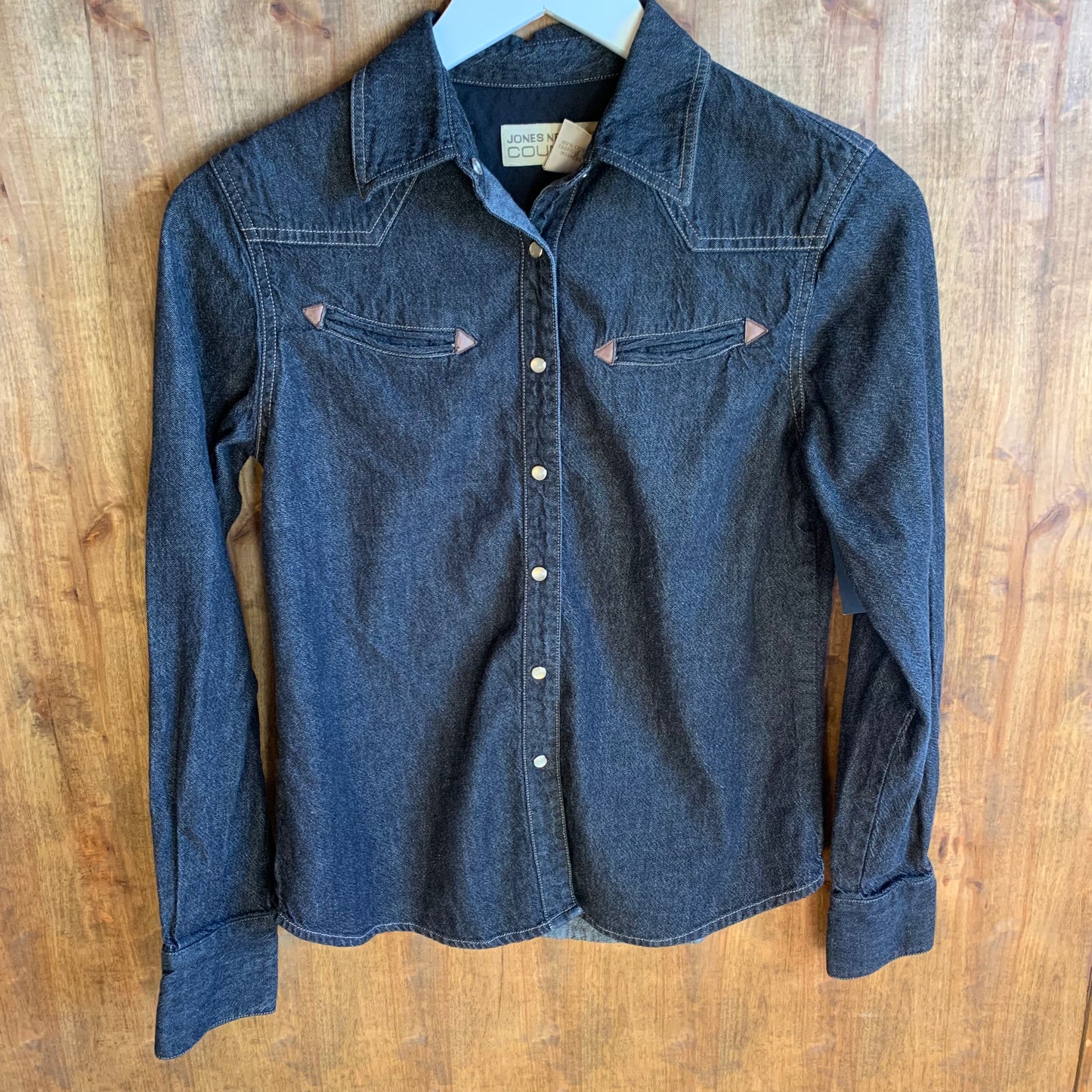 Rad 100% cotton faded black denim western button up. Feature smile breast pockets with leather accents. General signs of wear, in overall good vintage condition