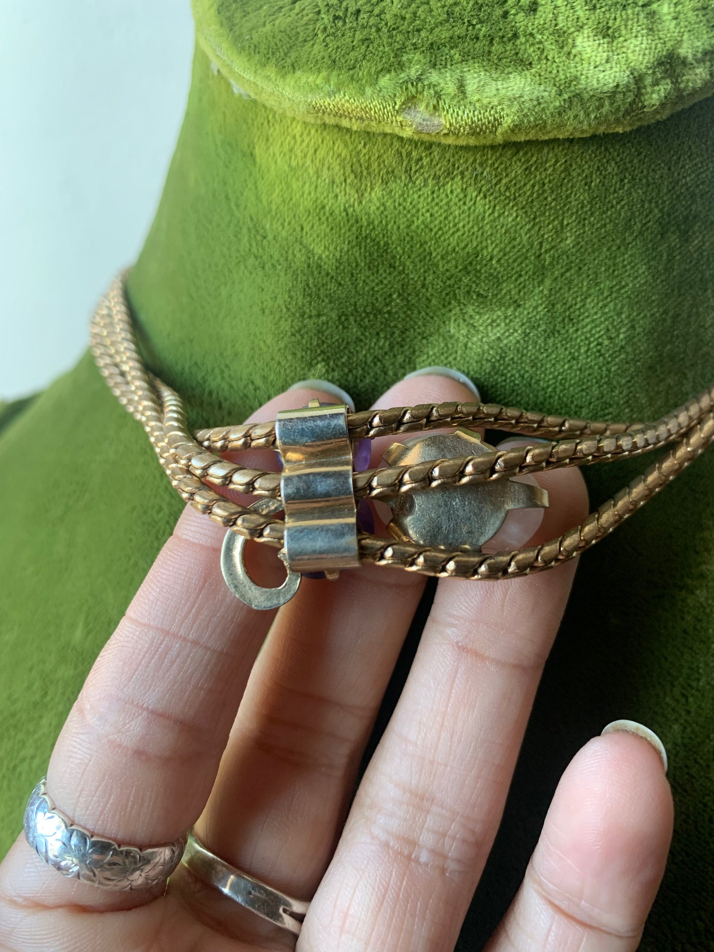 Gorgeous Goldtone 3 strand choker with pink and purple stone pendant. Such an elegant stunning piece! In good condition