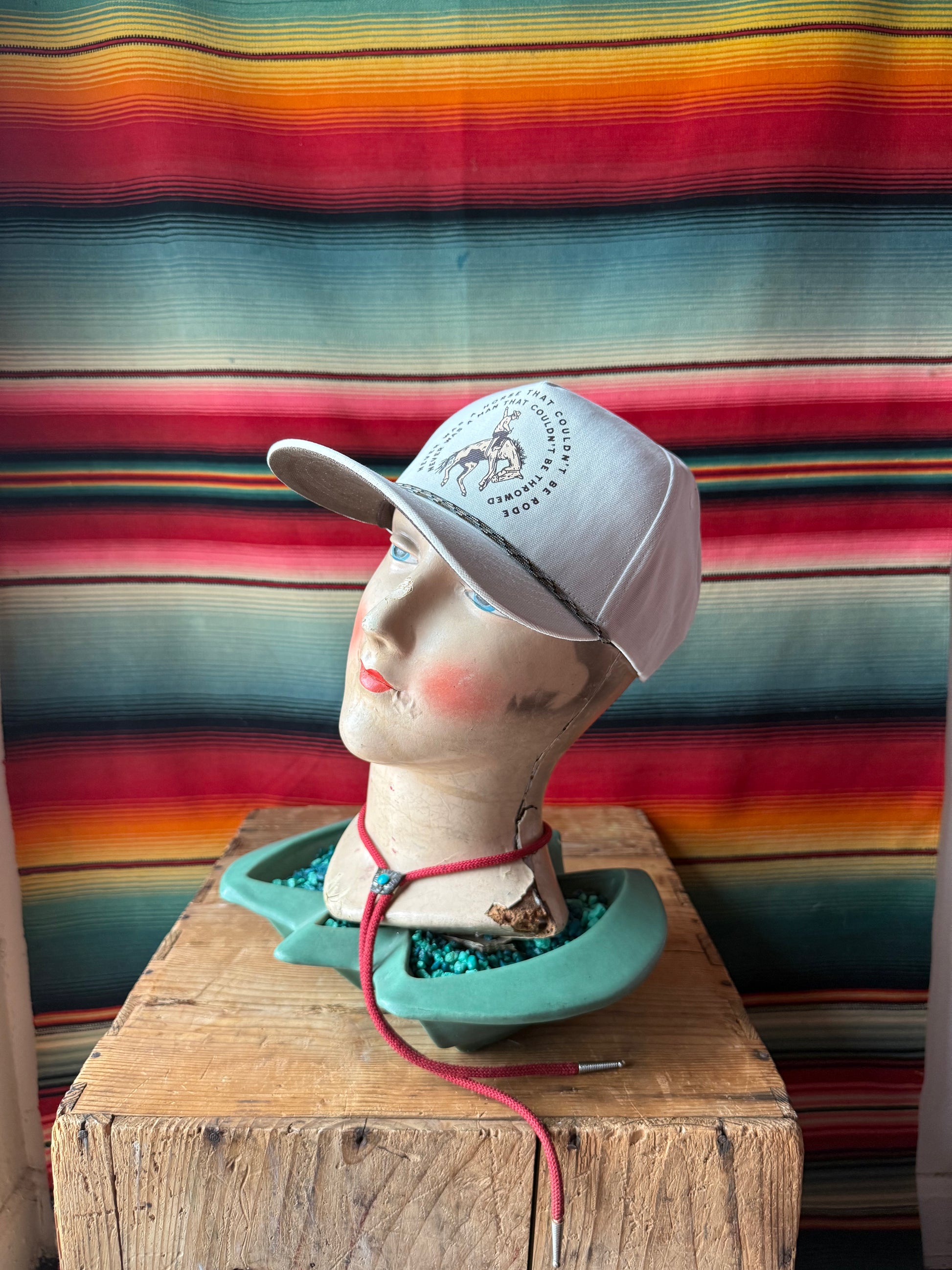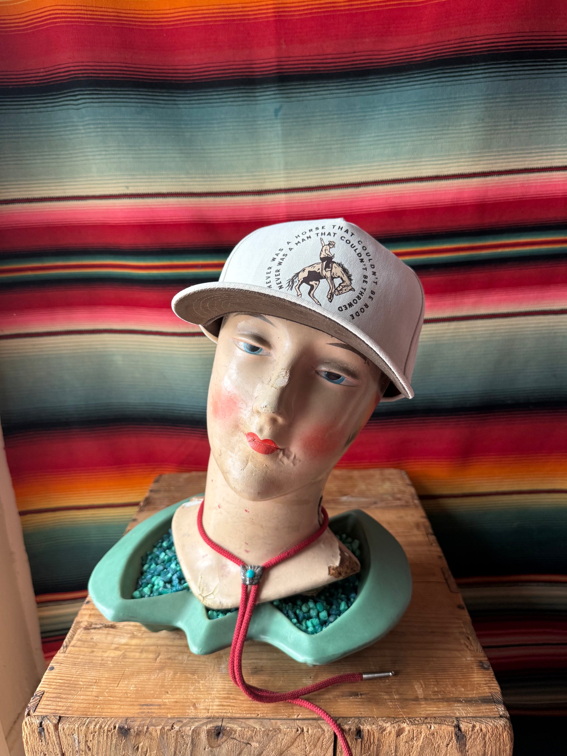 “Never was a horse that couldn't be rode, never was a man that couldn't be throwed.” Features a padded lining and adjustable snaps at the back.