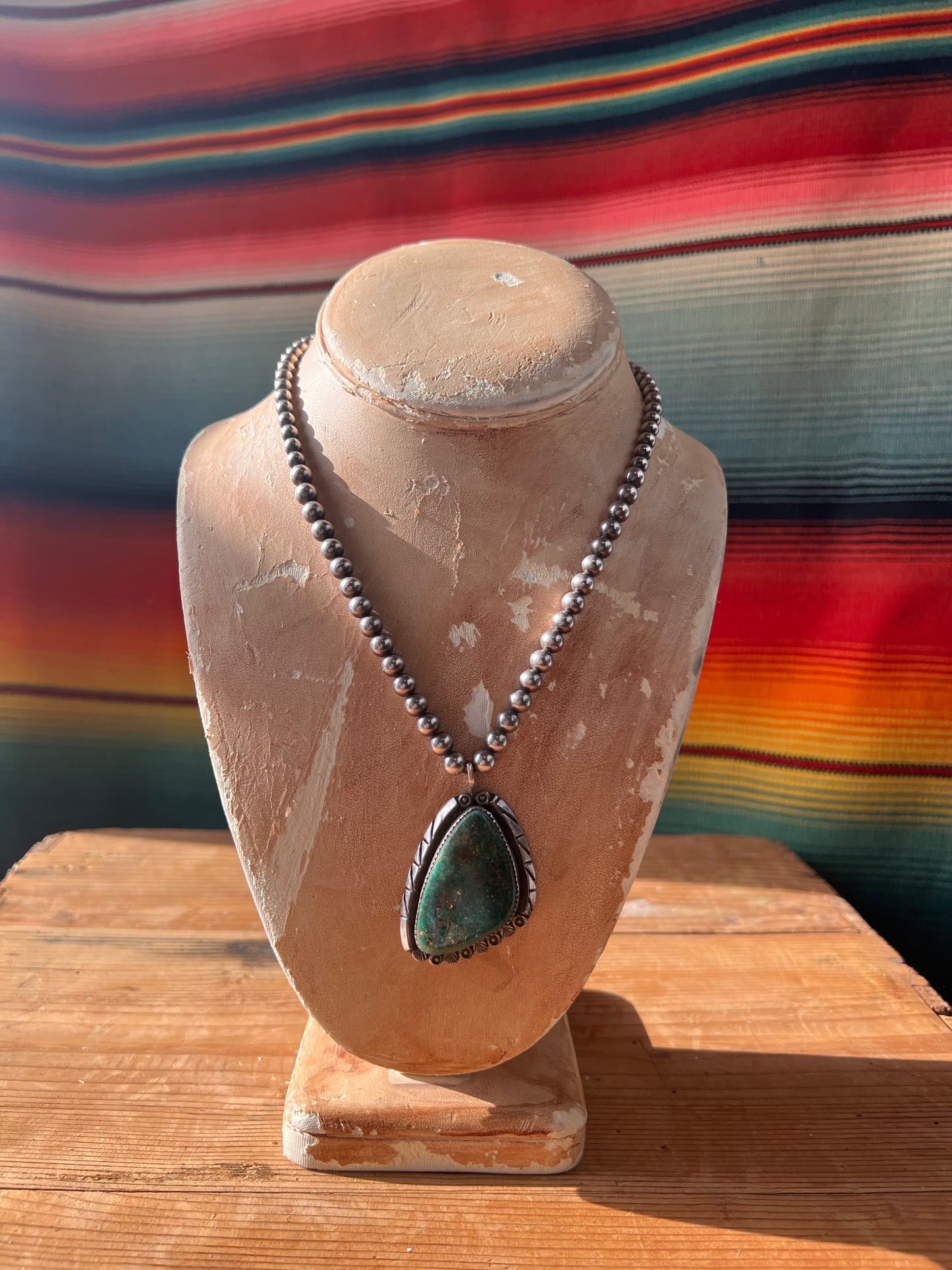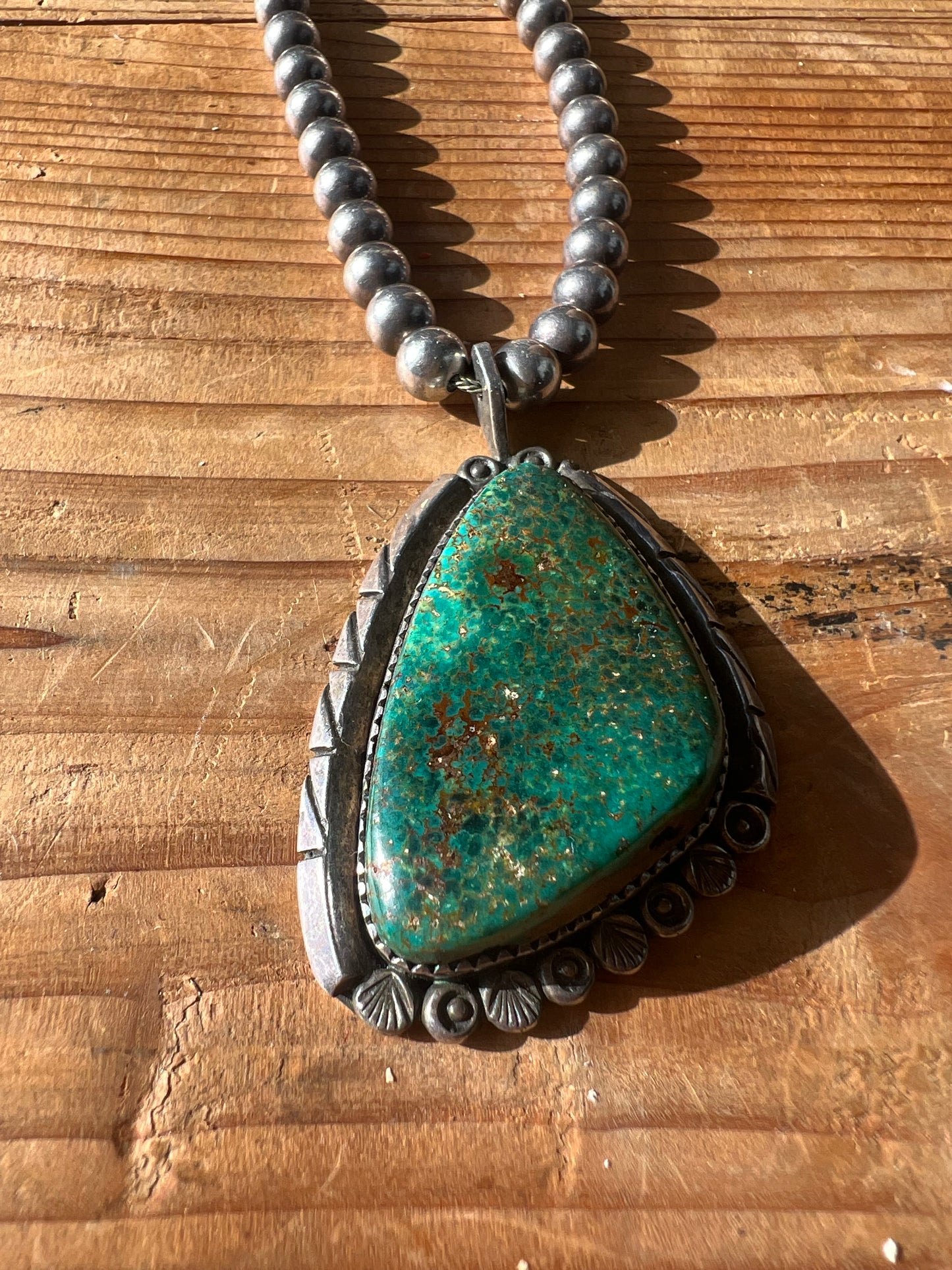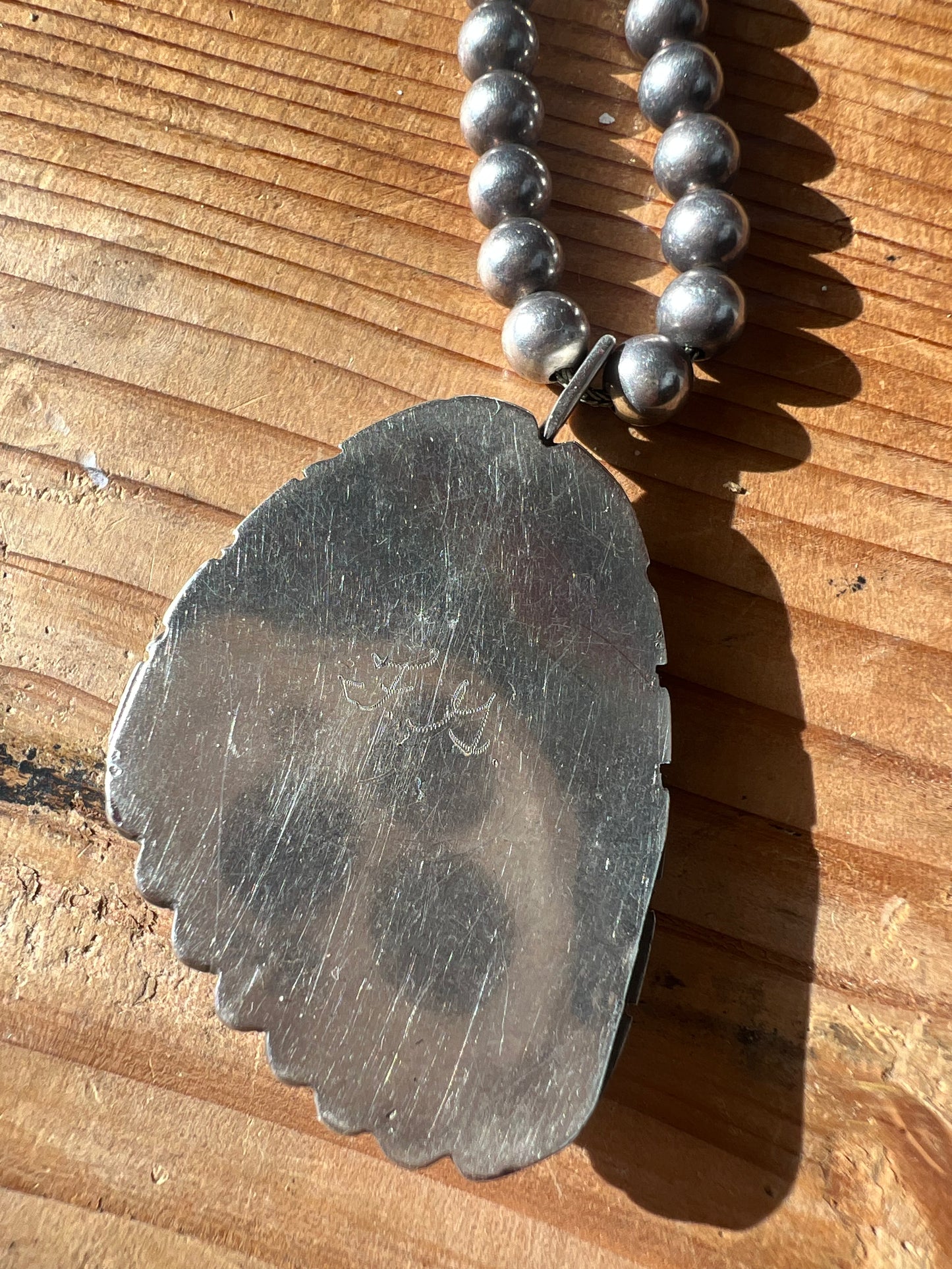 Really special vintage beaded necklace with a large turquoise pendant. Pendant has 2.5" drop, measures 1.5" wide, and is on a 17" sterling beaded chain. Initials F.G. are carved onto the back.