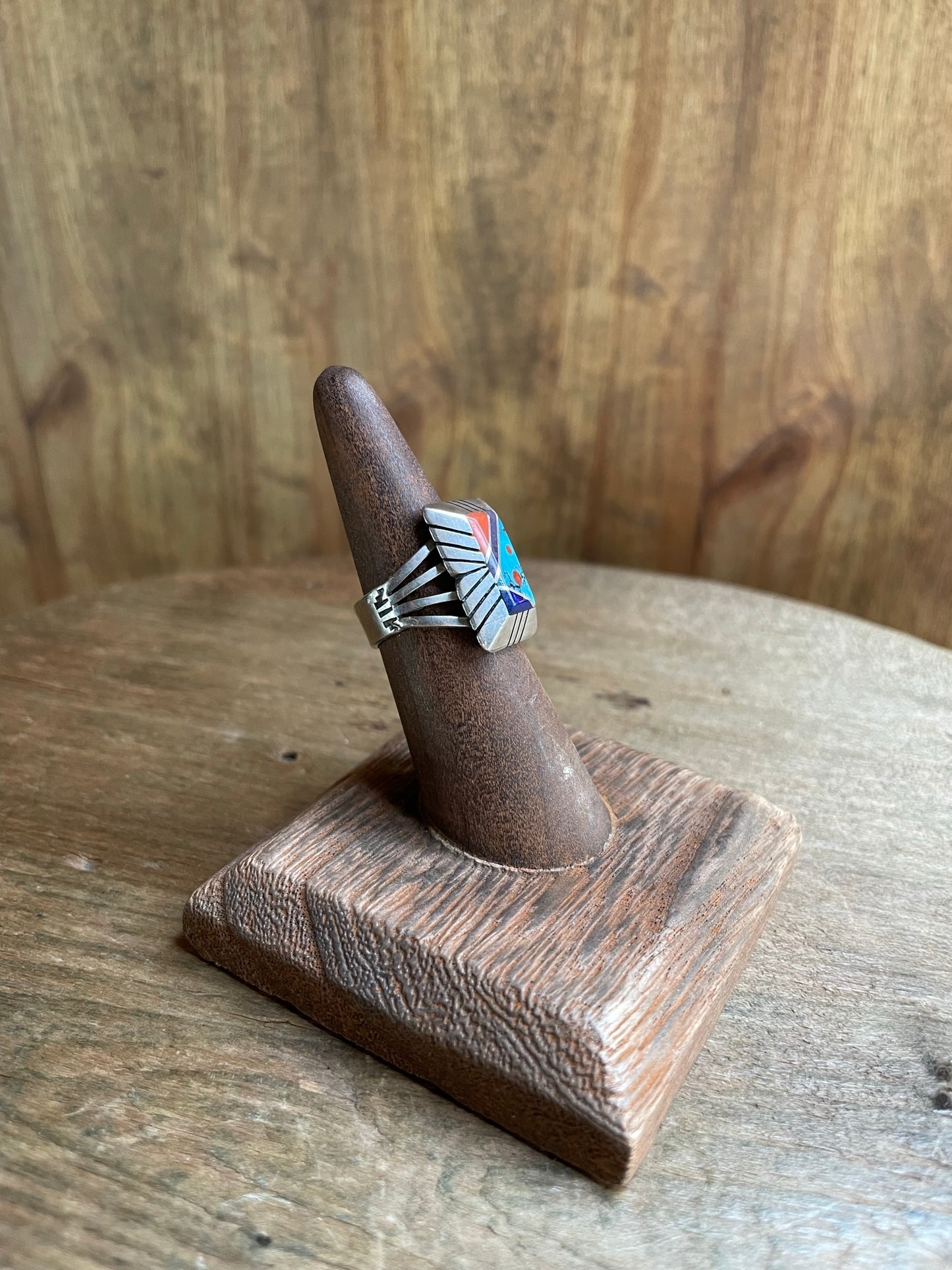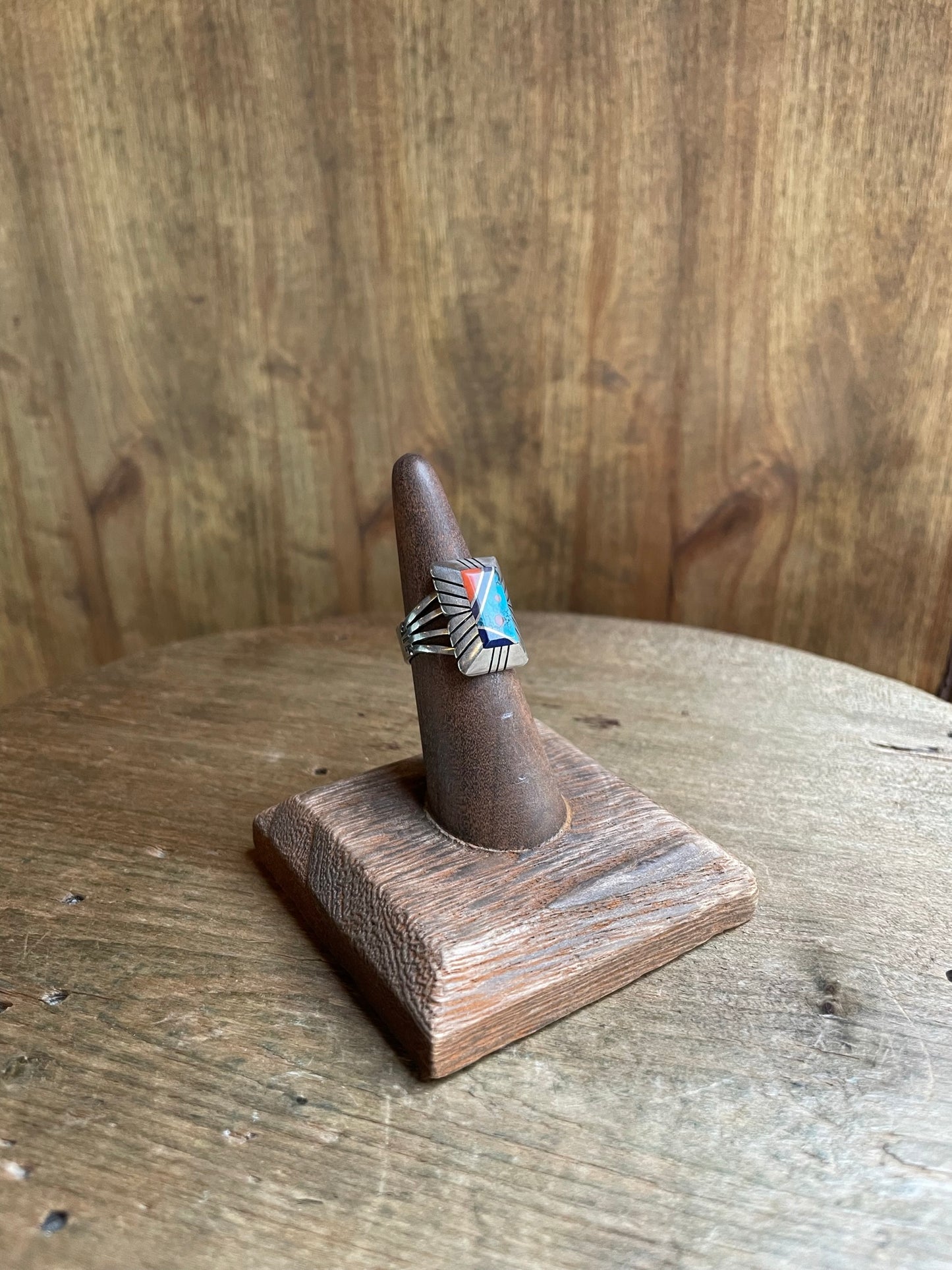 Beautiful rectangular inlay of turquoise, coral and dark blue stone. Stones create a Navajo motif and a striped imprint in the silver around the stones. The face is slightly raised and the striped detail continues around the band. Sterling Silver is slightly tarnished, but overall in good vintage condition.