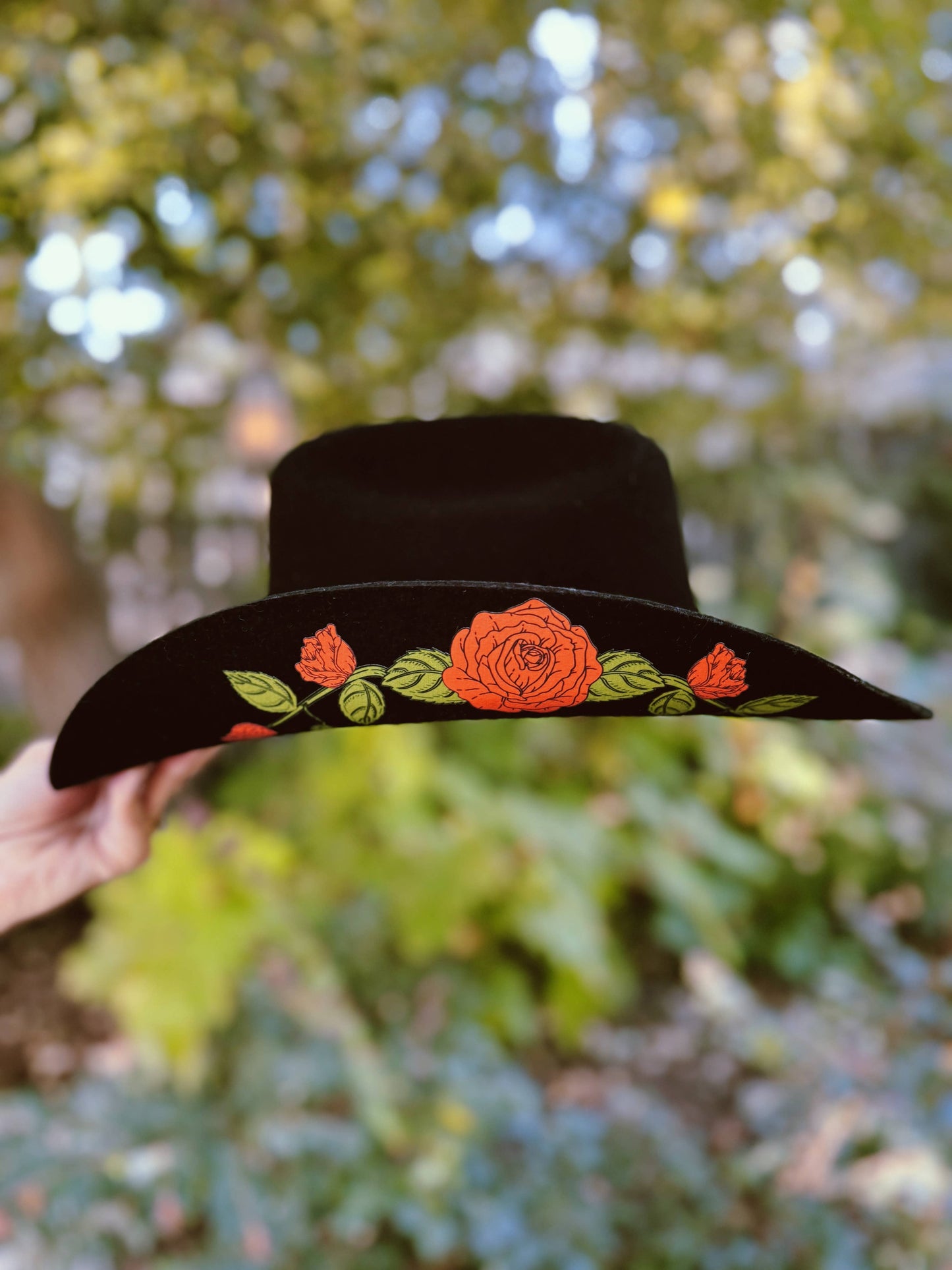 Meet the Marlowe! Featuring a rose (June birth flower) this hat is equally suited to your next concert as it is to your date night.
