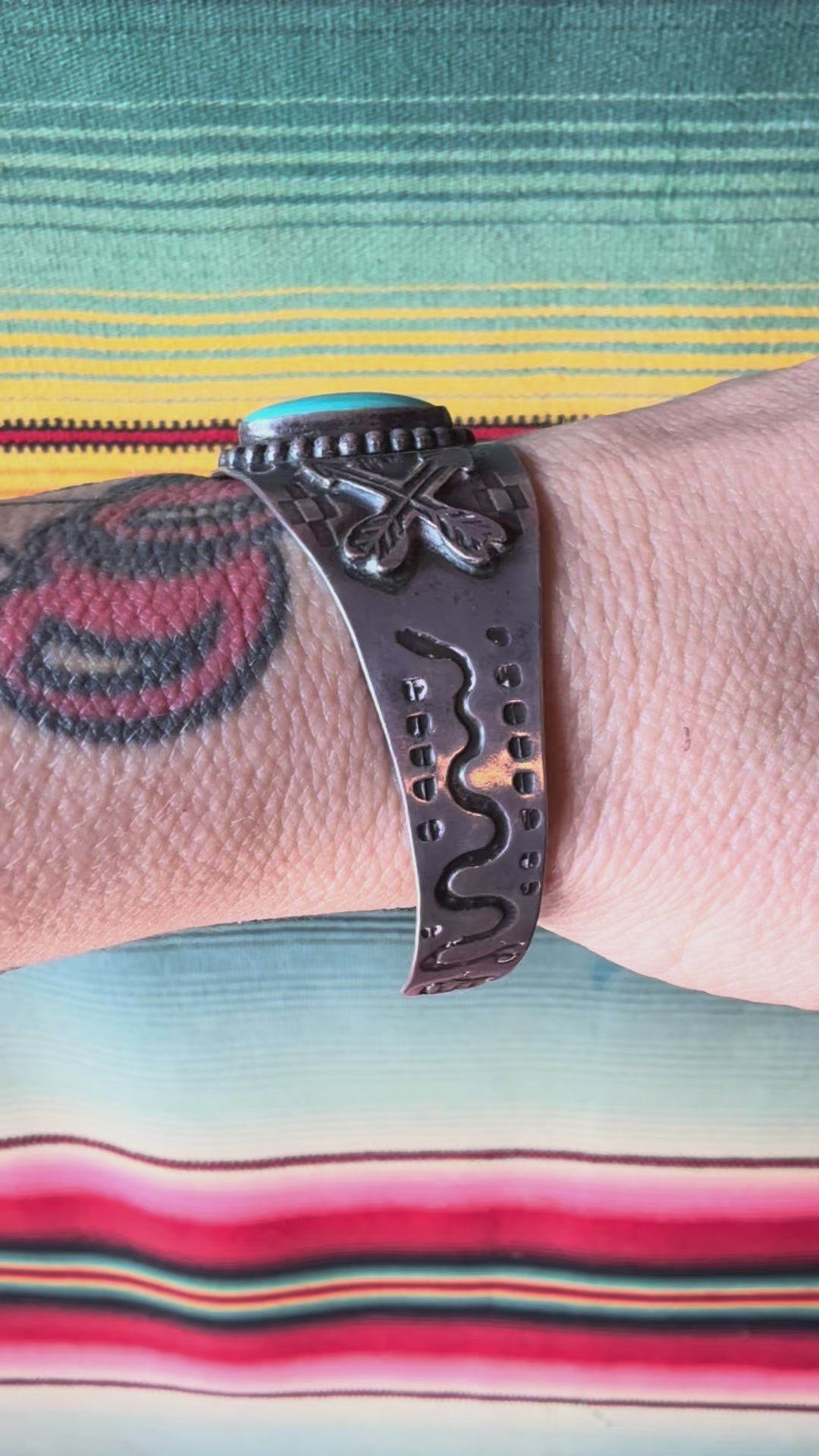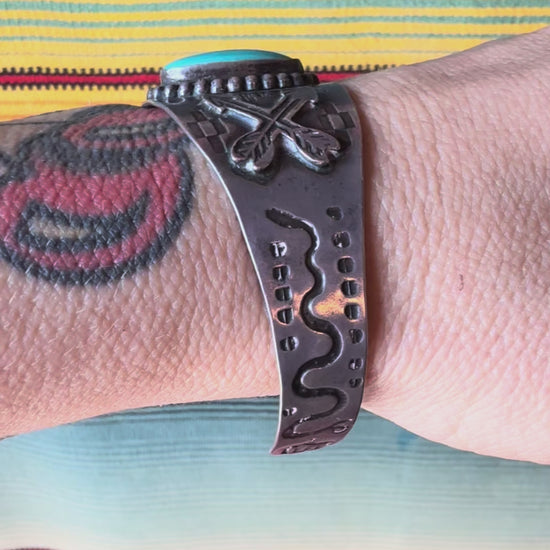Vintage Fred Harvey Era Sterling and Turquoise Cuff - Arrows and Snake