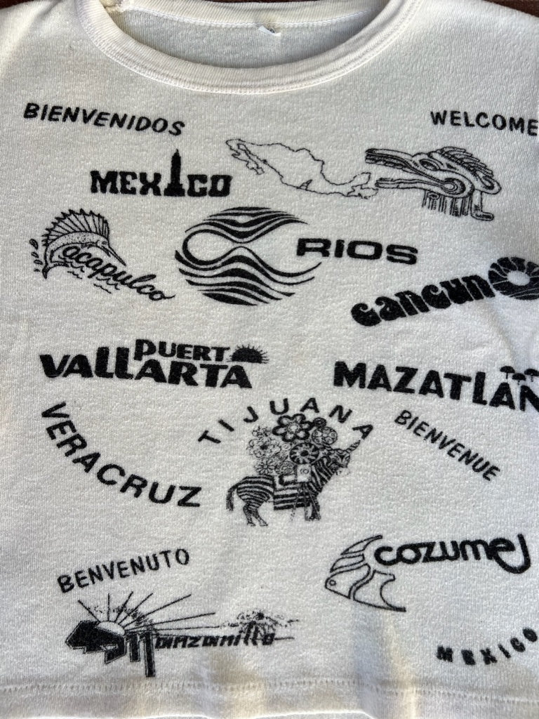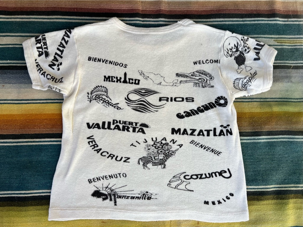 This is likely a kids shirt but would fit a small adult too. All over print of tourist destinations in Mexico. So cute!