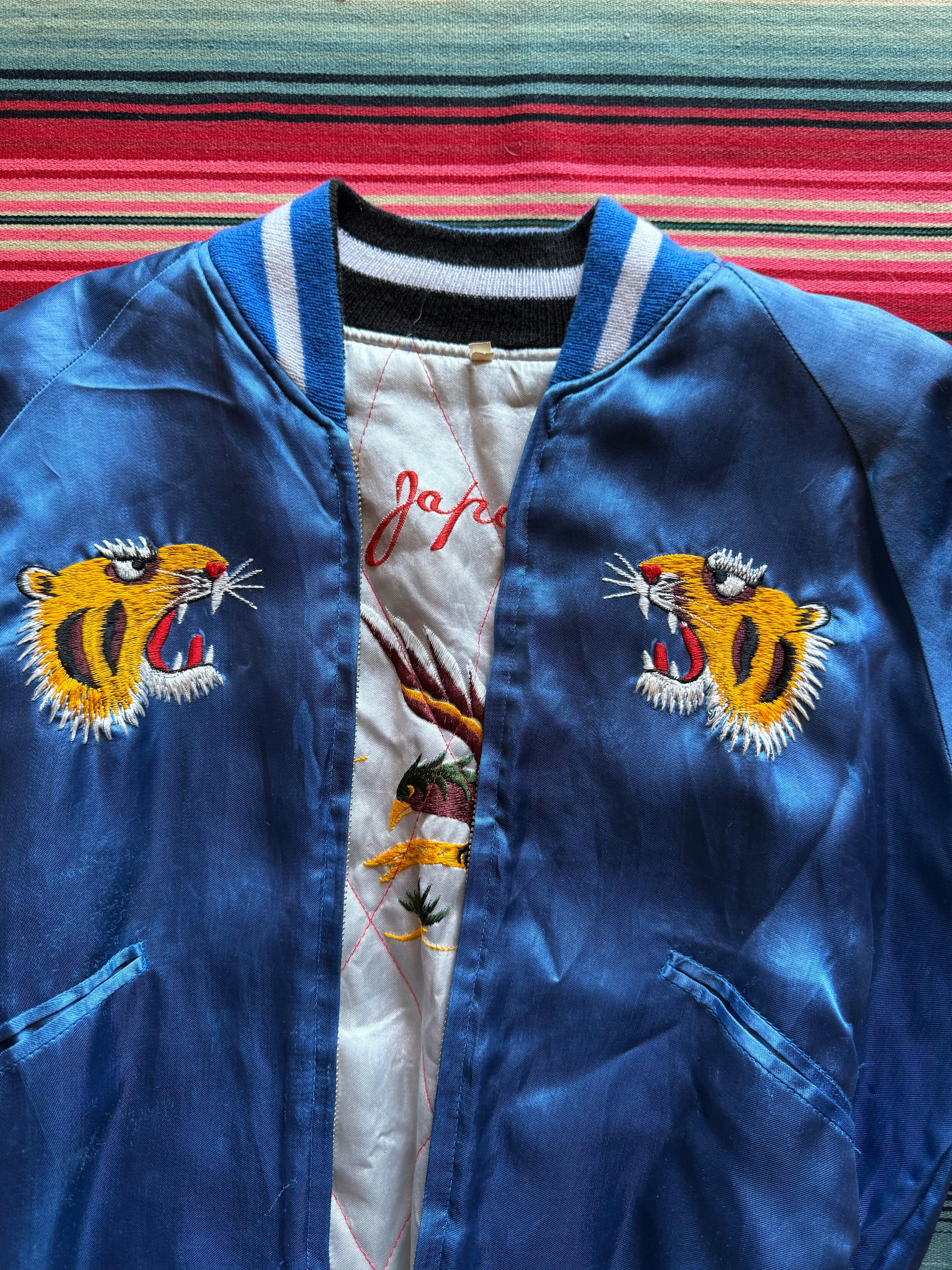 Killer vintage reversible souvenir jacket. One side is blue with tigers, the other is silver with mountains and an eagle. YKK zipper. Excellent condition.
