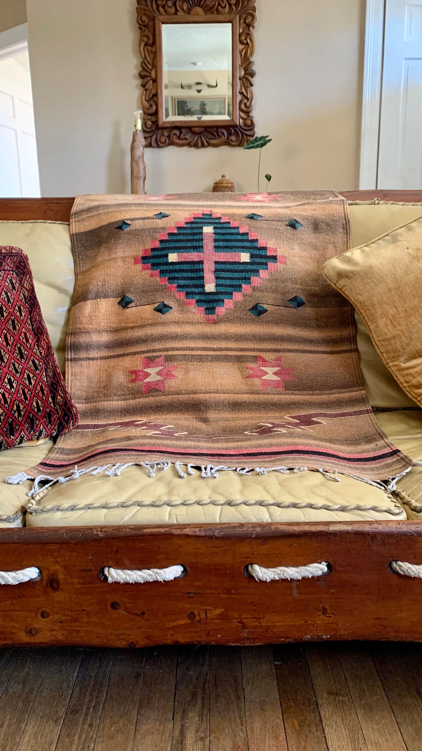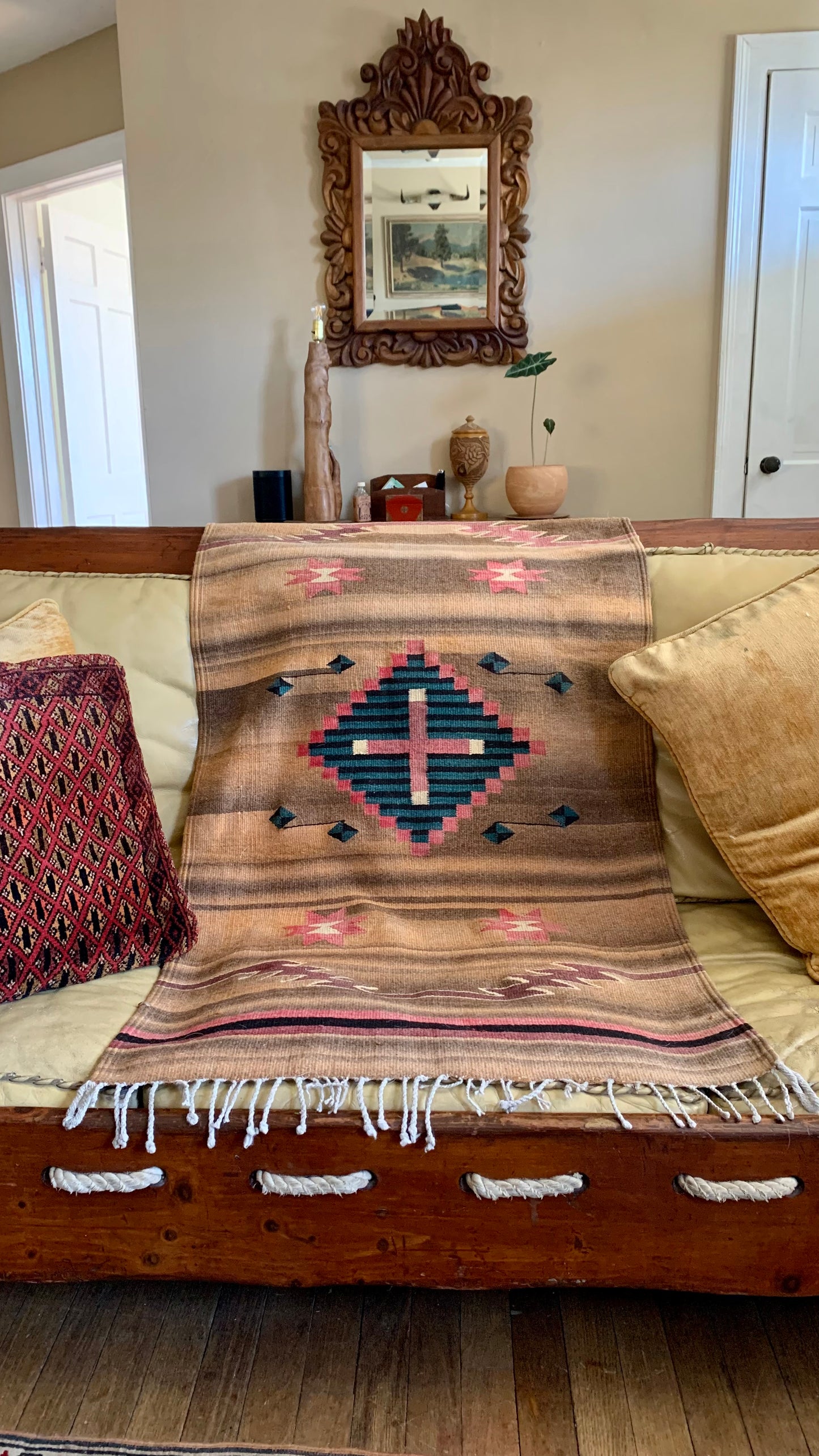 Stunning vintage neutral, teal, and dusty pink southwestern woven runner/rug in excellent vintage condition. Unique and can be used as a rug, table runner, or wall hanger. General signs of wear, but no serious flaws to note.