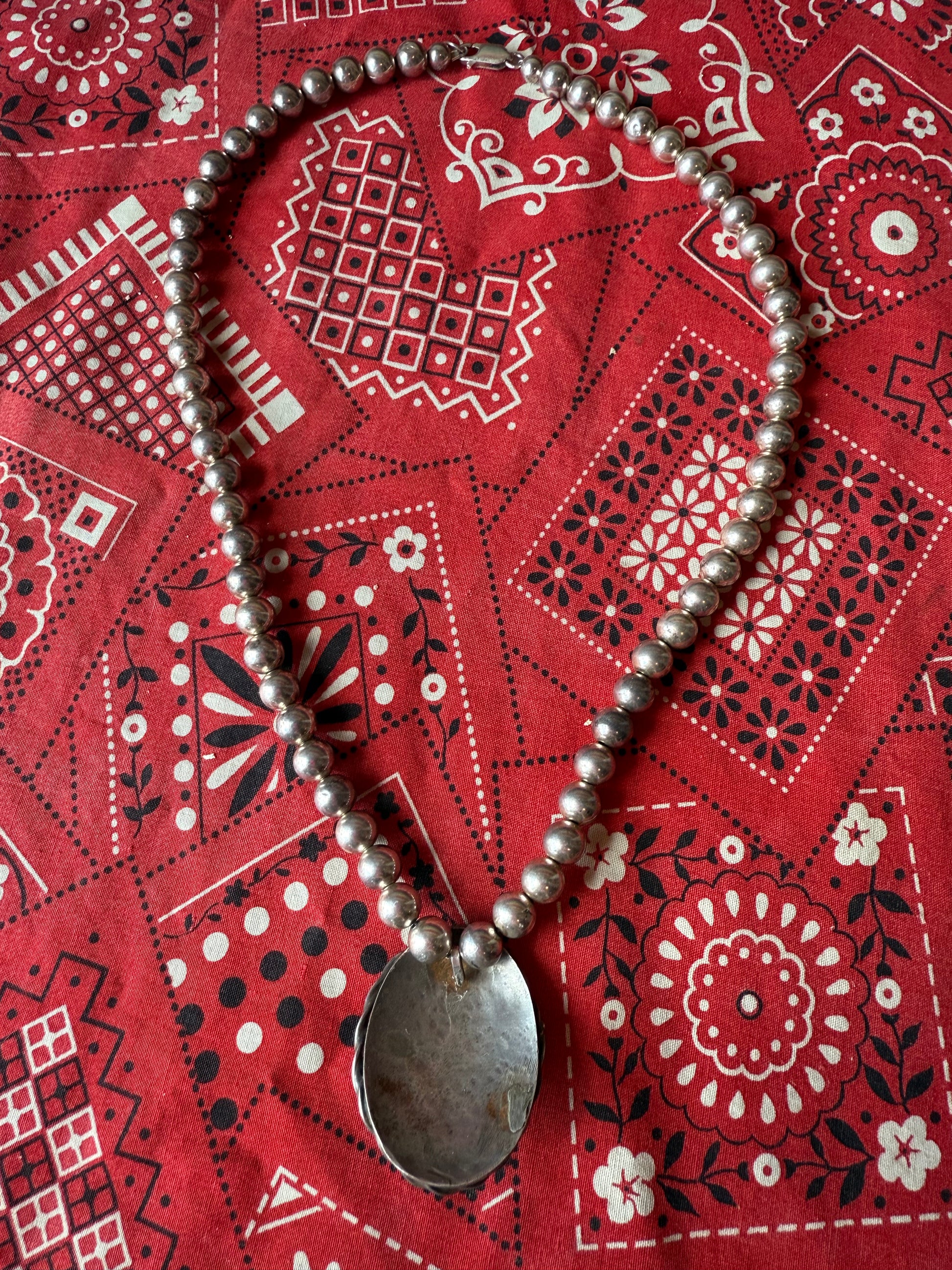 1.75" long by 1.25" wide sterling & turquoise pendant on a 20" sterling pearl chain with lobster claw closure.