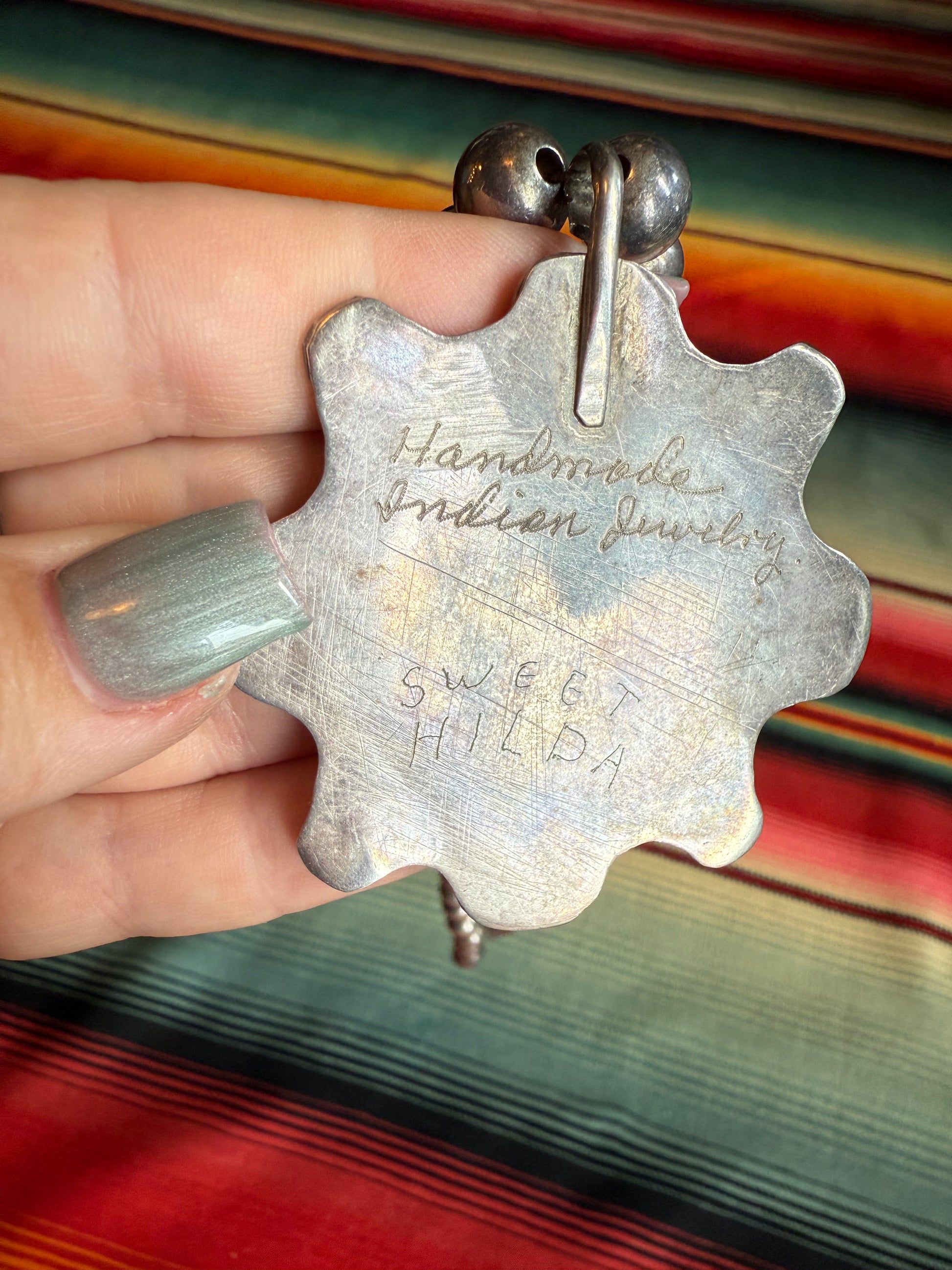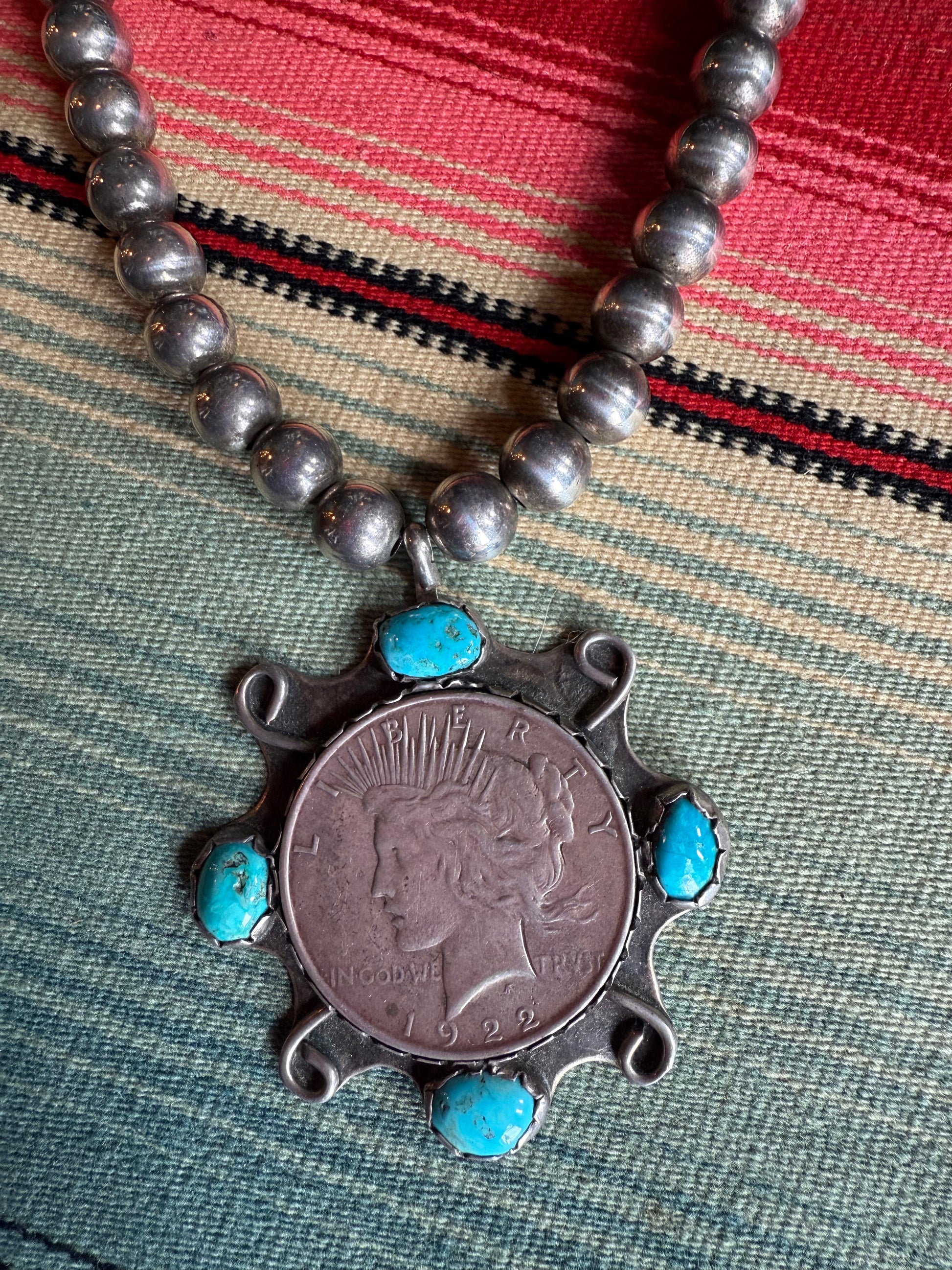 Vintage Sterling Pearl Necklace with Sterling Peace Dollar and Turquoise Pendant