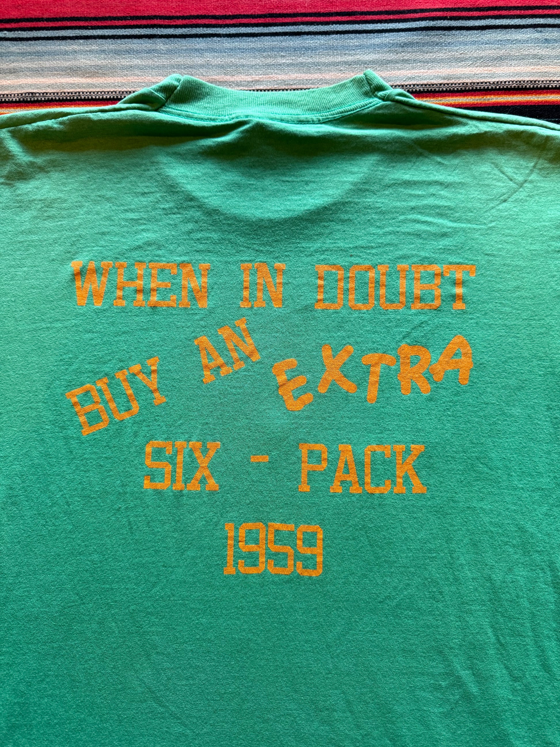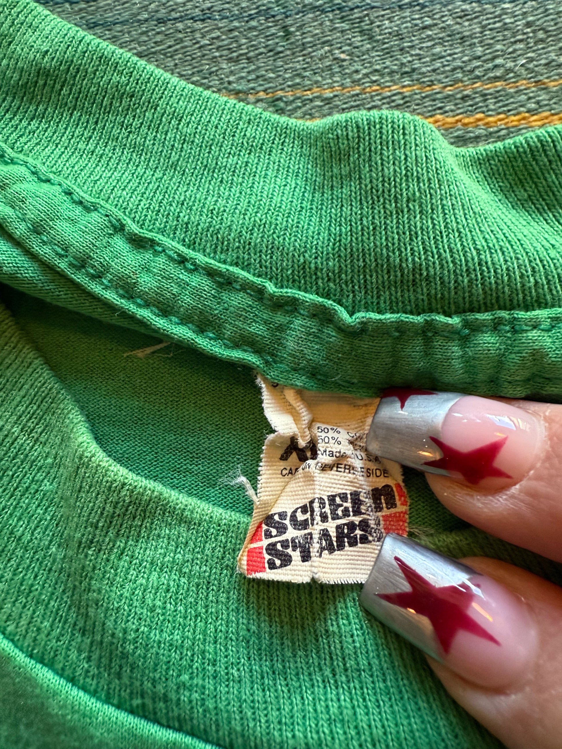 Vintage 1980s single stitch double print Woodlawn 30 year school reunion tee. Back reads "When in doubt buy an extra six-pack."  Super soft, beautiful green color, screen stars tag. Two small faint stains near the middle bottom on the front, otherwise great condition.