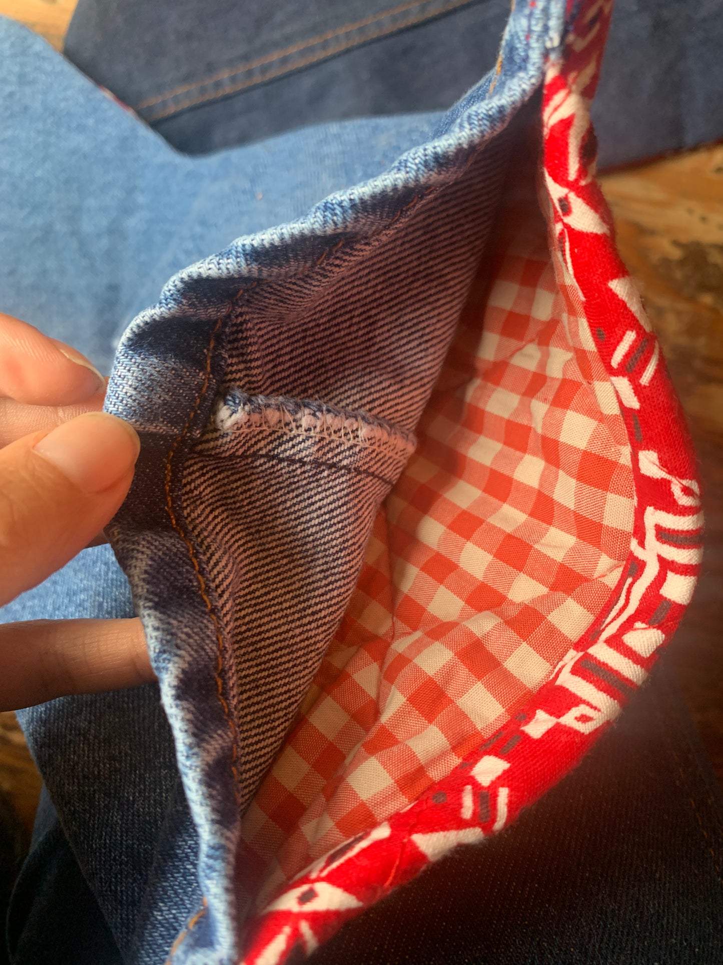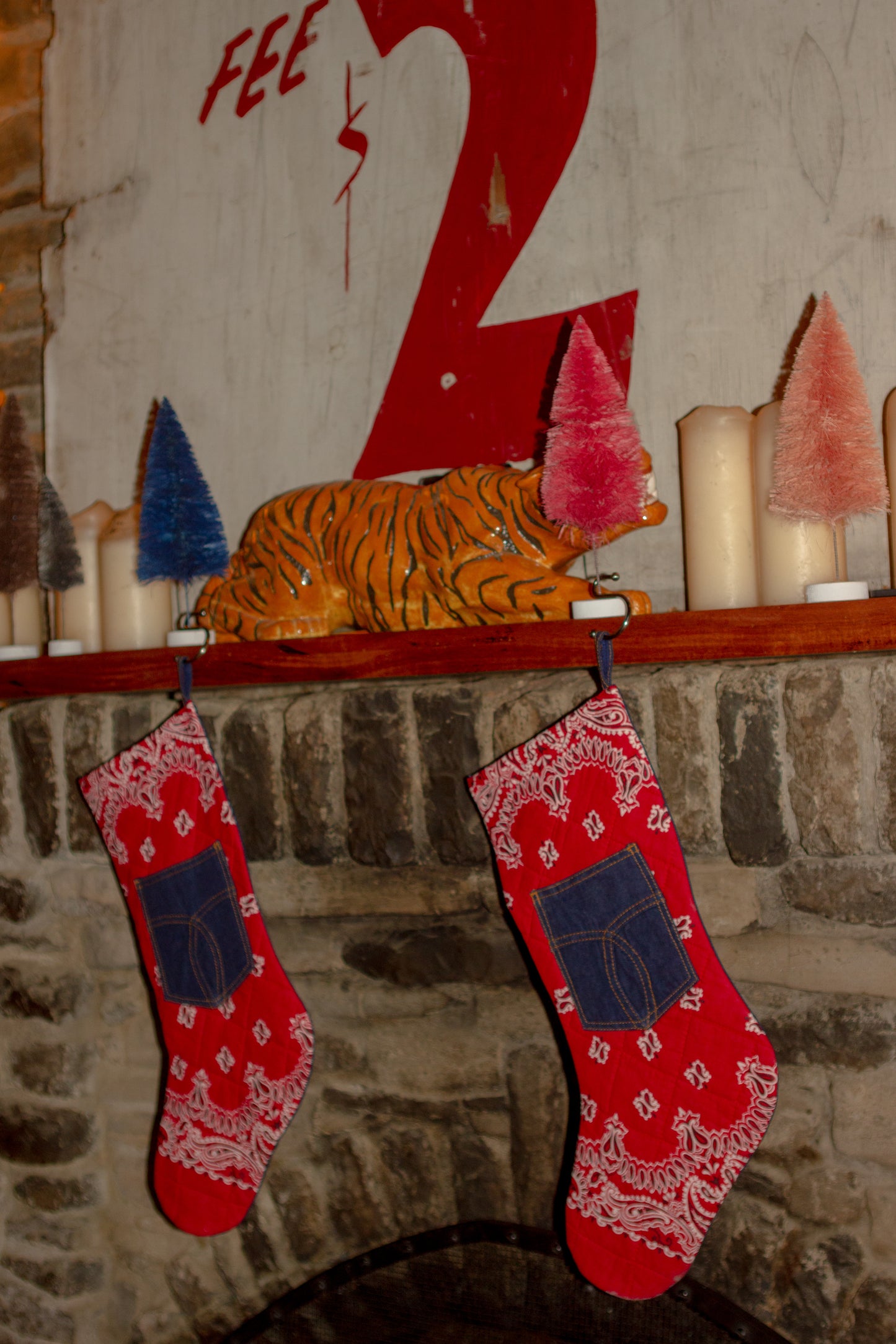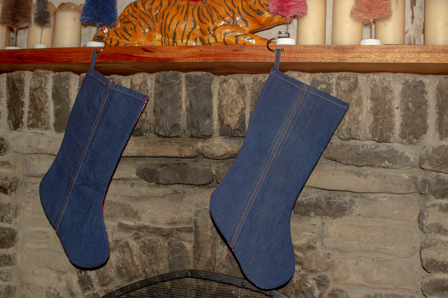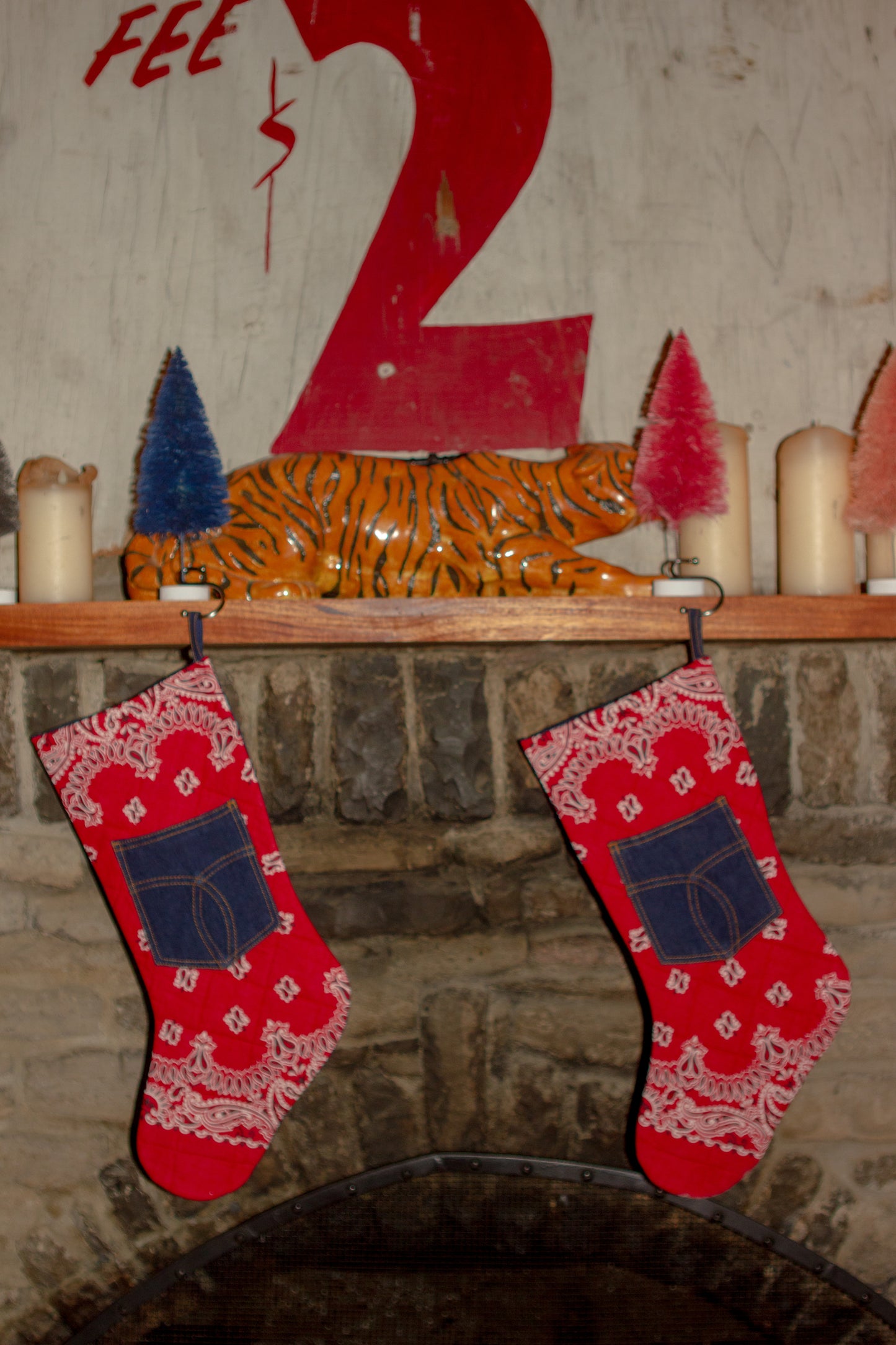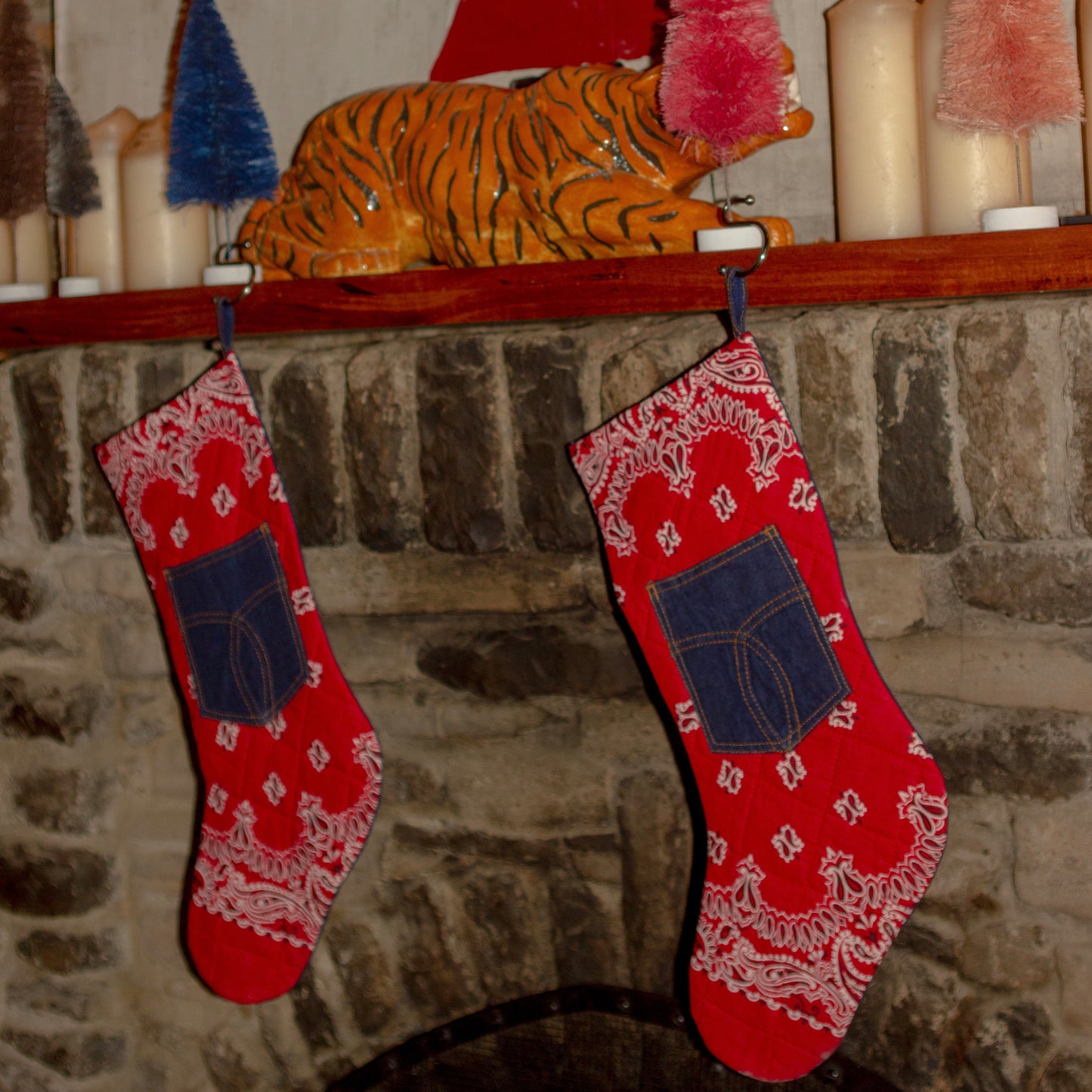 All stockings are red bandana print and denim, however there are some slight differences between them due to their up-cycled nature and the one you receive may vary slightly from pictured. Examples are different pocket details and slightly different bandana pattern.