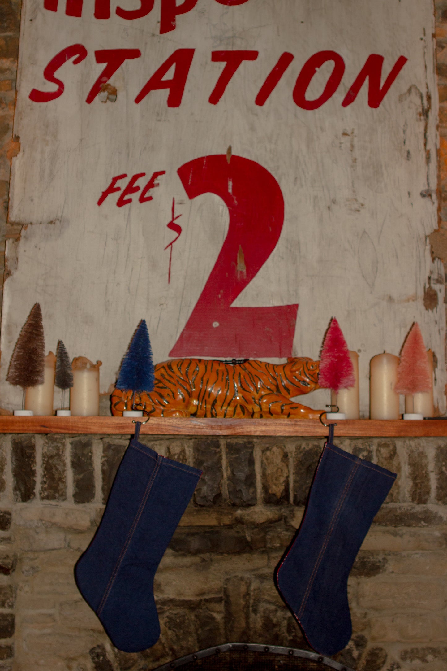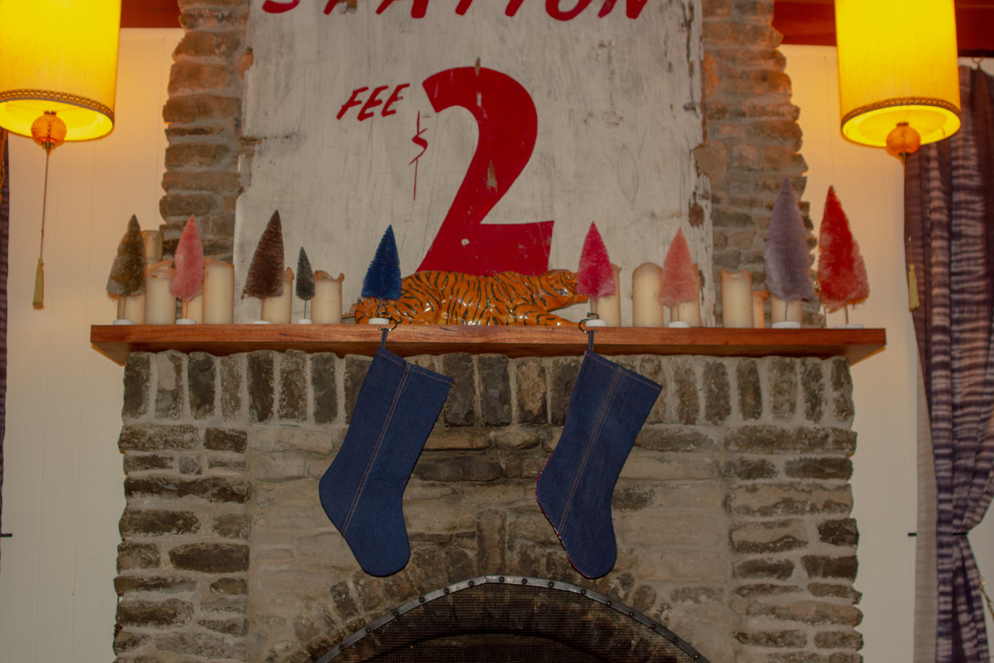 Deck the halls with our made in house up-cycled vintage denim and vintage bandana print stockings. So cute you'll want to leave them up year round! The bandana fabric has been treated like a quilt in order to make it sturdier and features a different fabric on the interior of the stocking. Some have a red and white gingham while others have a red and white polkadot pattern. There are 2 denim washes available, please be sure to select which you would like at check out. Buy one for $58 or get two for $100. All are in great condition and have a loop for hanging.