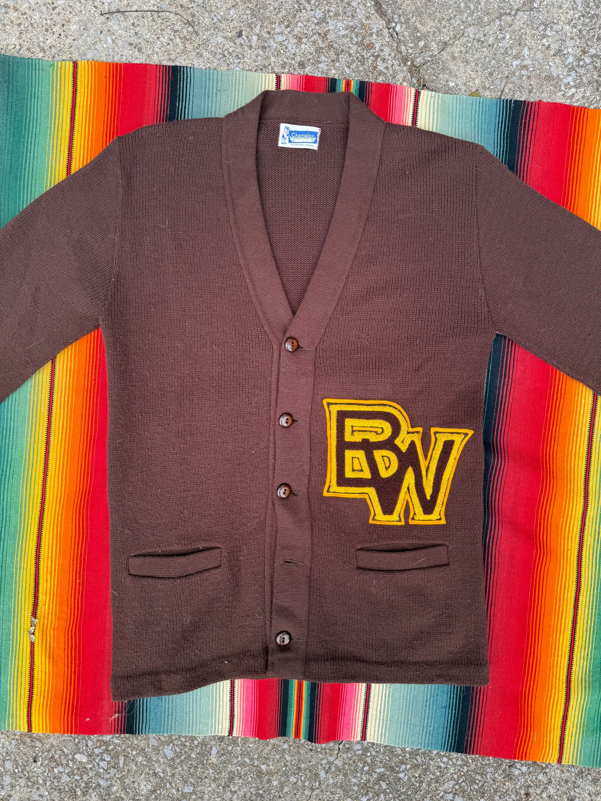 Suit up in vintage varsity style with this Champion “BW” letterman knit cardigan. Crafted in rich brown wool with a “BW” patch, perfectly detailed with classic button front, ribbed cuffs, and that signature Champion quality that’s made to last. A rare find for collectors or anyone who loves true Americana fashion.