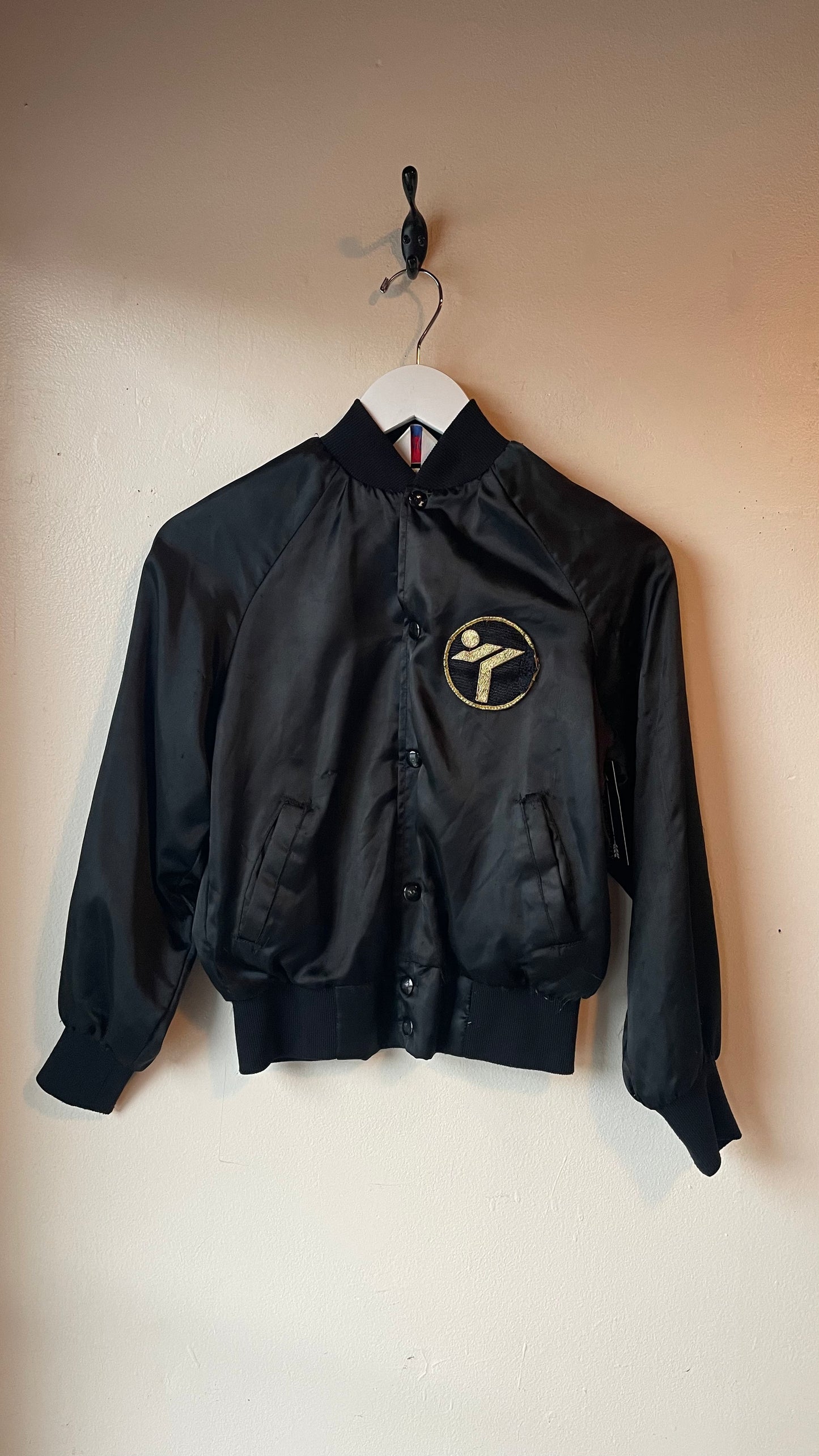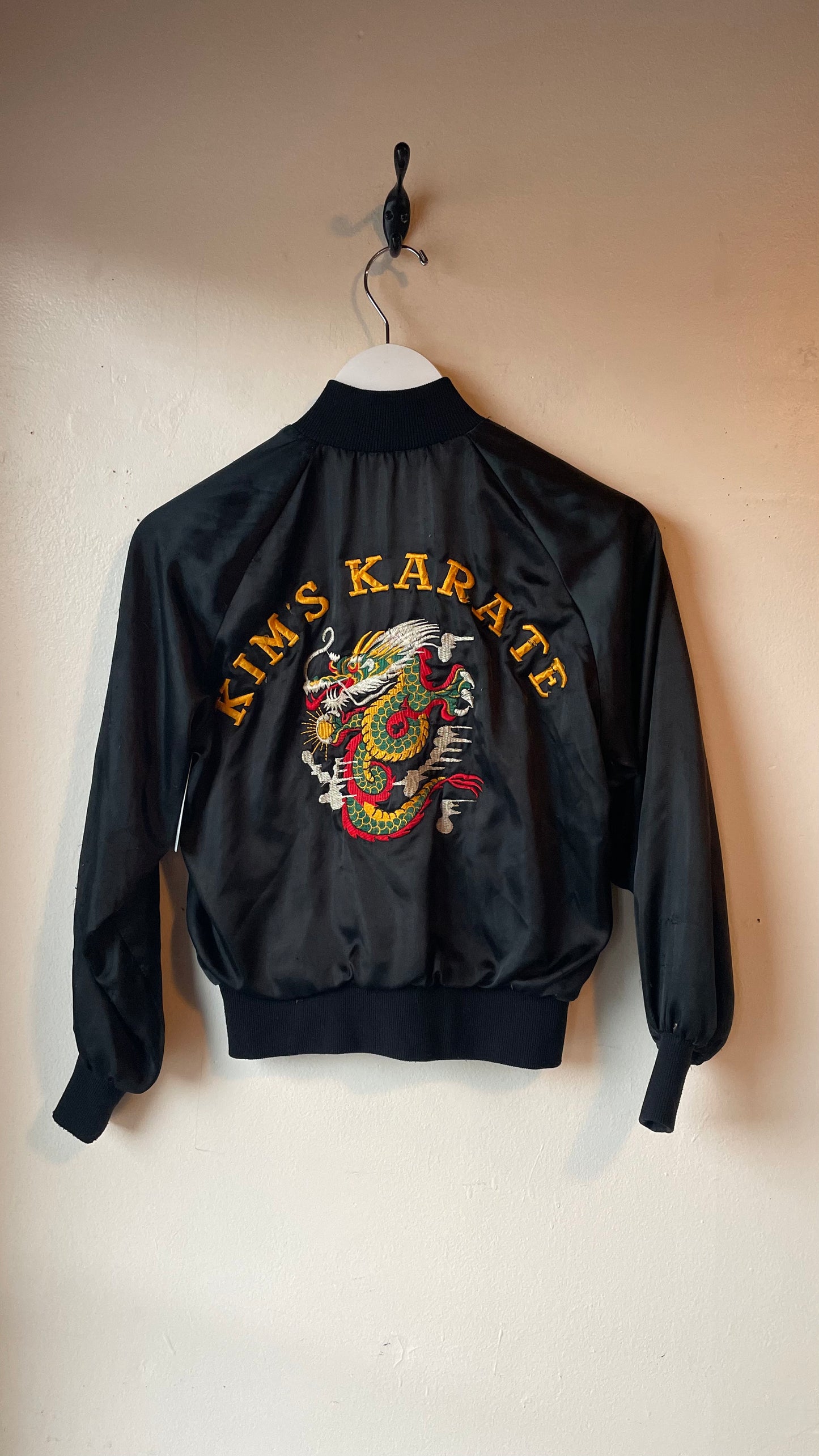 The coolest bomber! Black satin with patches on the front and back; back patch reads "Kims Karate" with a dragon. In good vintage condition