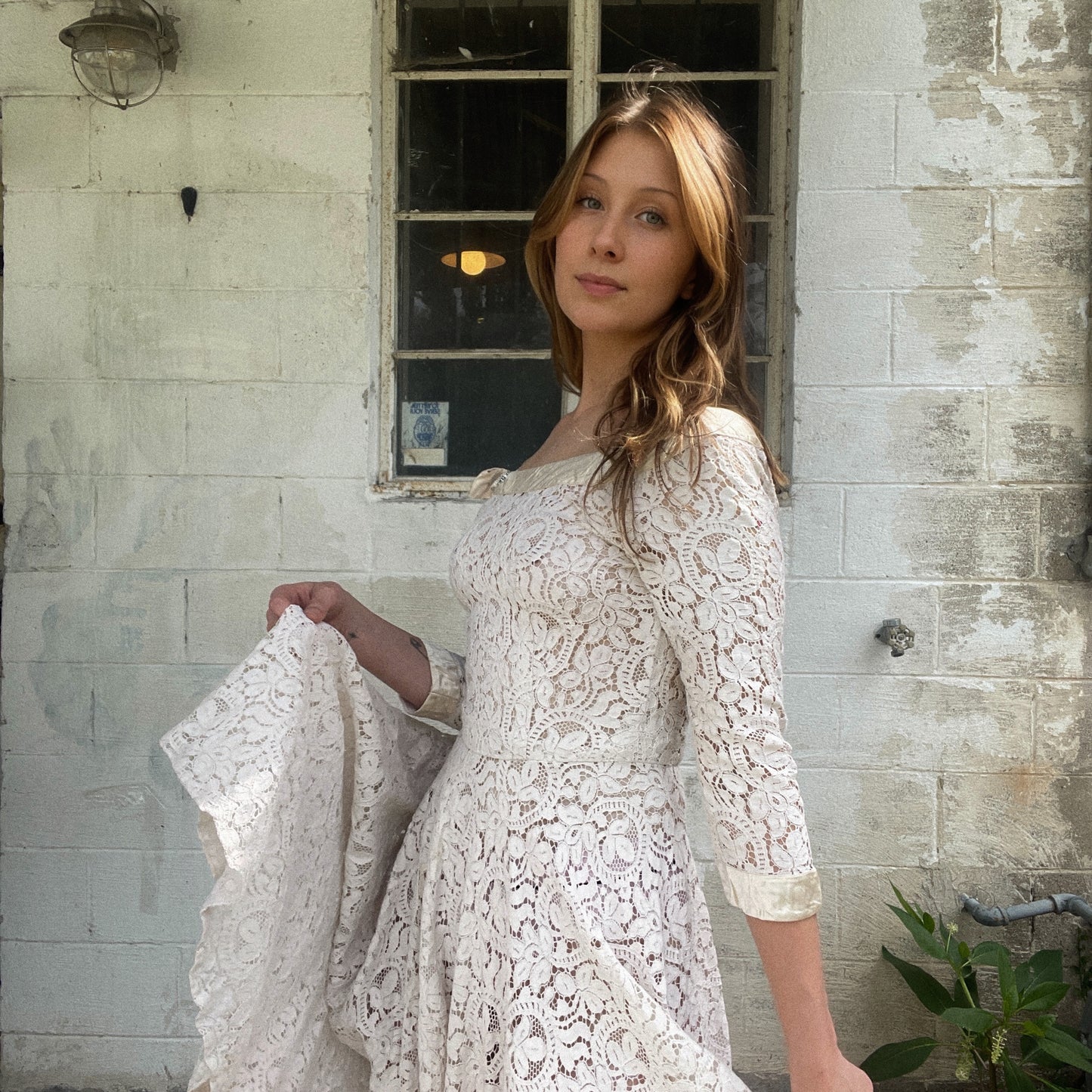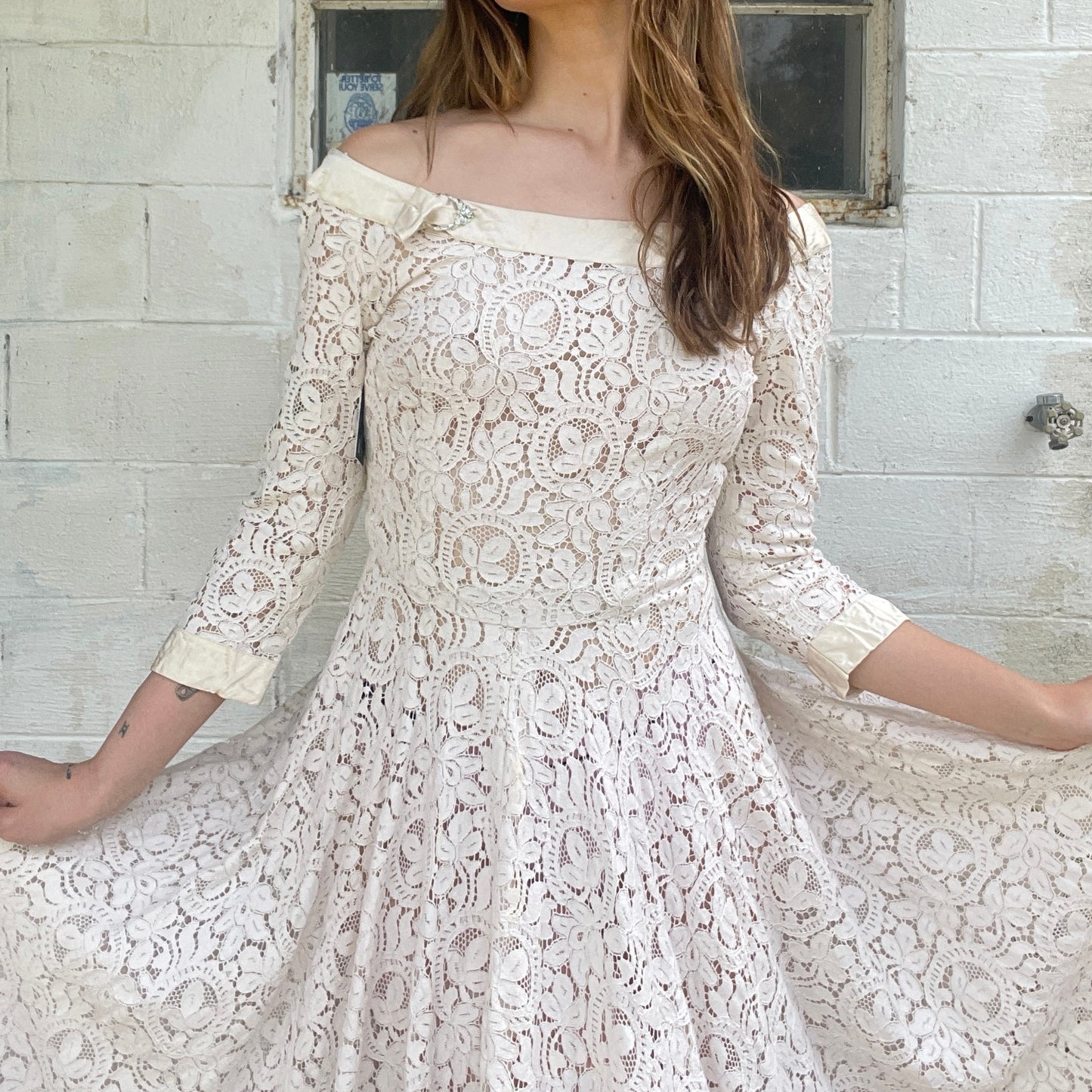 Beautiful lace dress with a satin collar and embellishment. This dress is so versatile and could be worn for a picnic all the way to a wedding.