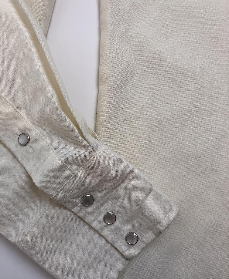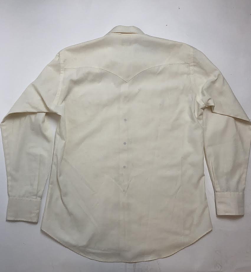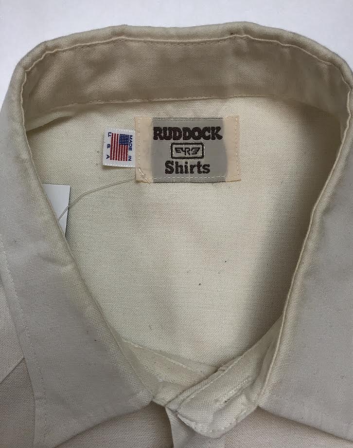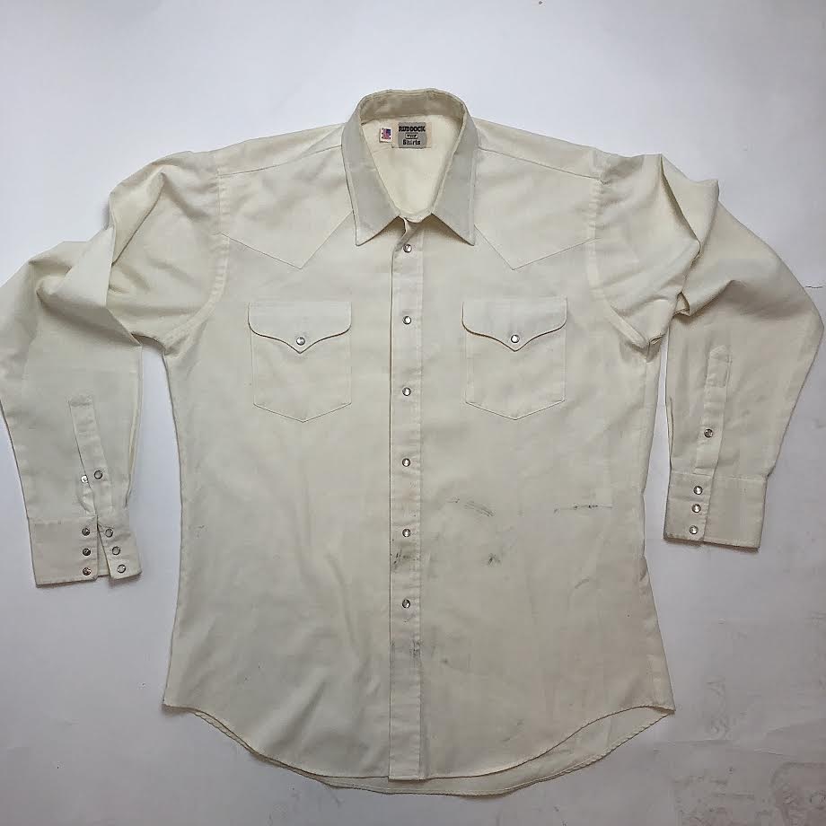 MADE IN THE USA Vintage Ruddock men's button down shirt. This shirt features a cream tone with white pearl snap details. There are some age stains, but overall a great cream based shirt to add to any collection!