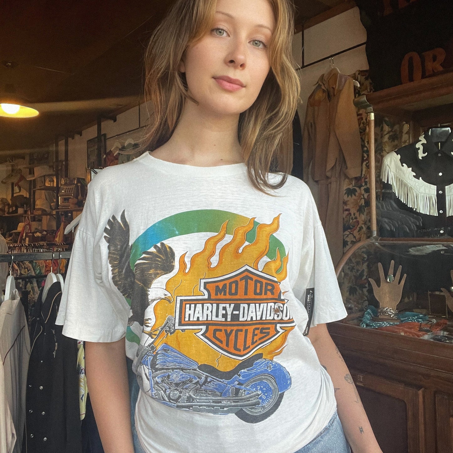 Vintage Harley Davidson flame and eagle tee made with a single stitch. Some wear in fabric.