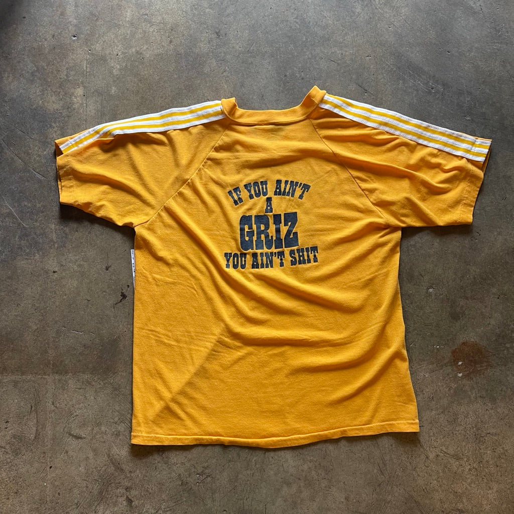 University of Montana Athletic tee with jersey style sleeves and 'If you aint a Griz you aint shit!' on the back. Tee is perfectly worn in and has a great length to the bottom hem.