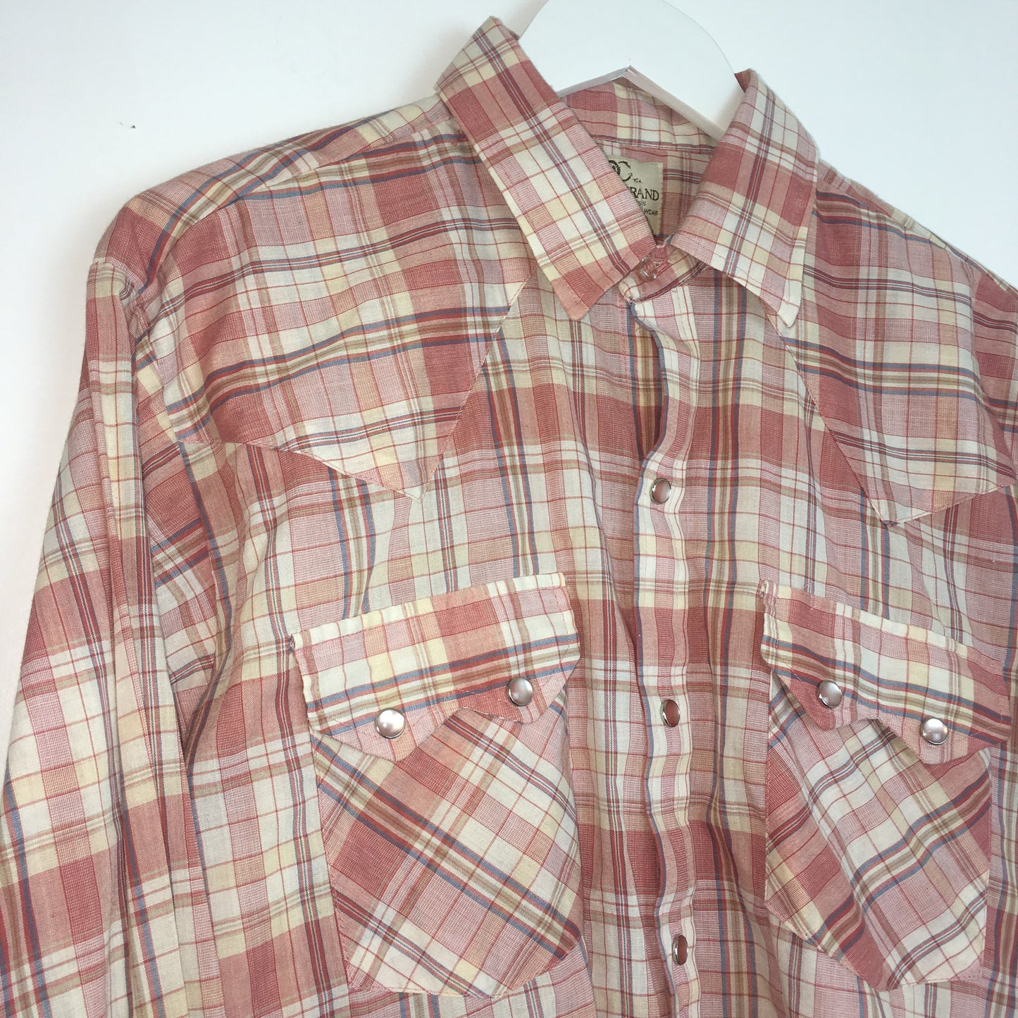 Vintage, salmon plaid pearl snap shirt. Soft and lightweight throughout. Features sawtooth style pockets, and pink hued pearl snaps. No flaws, in great vintage condition.