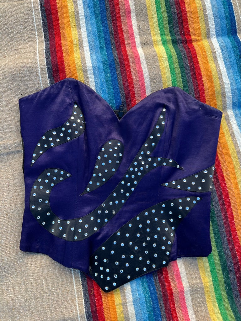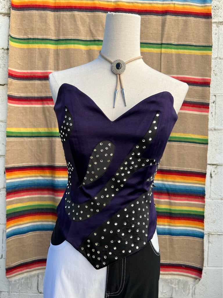 Super sexy y2k bustier top. Dark purple satin with black embellishments studded with huge, sparkling rhinestones. Zip closure at back.